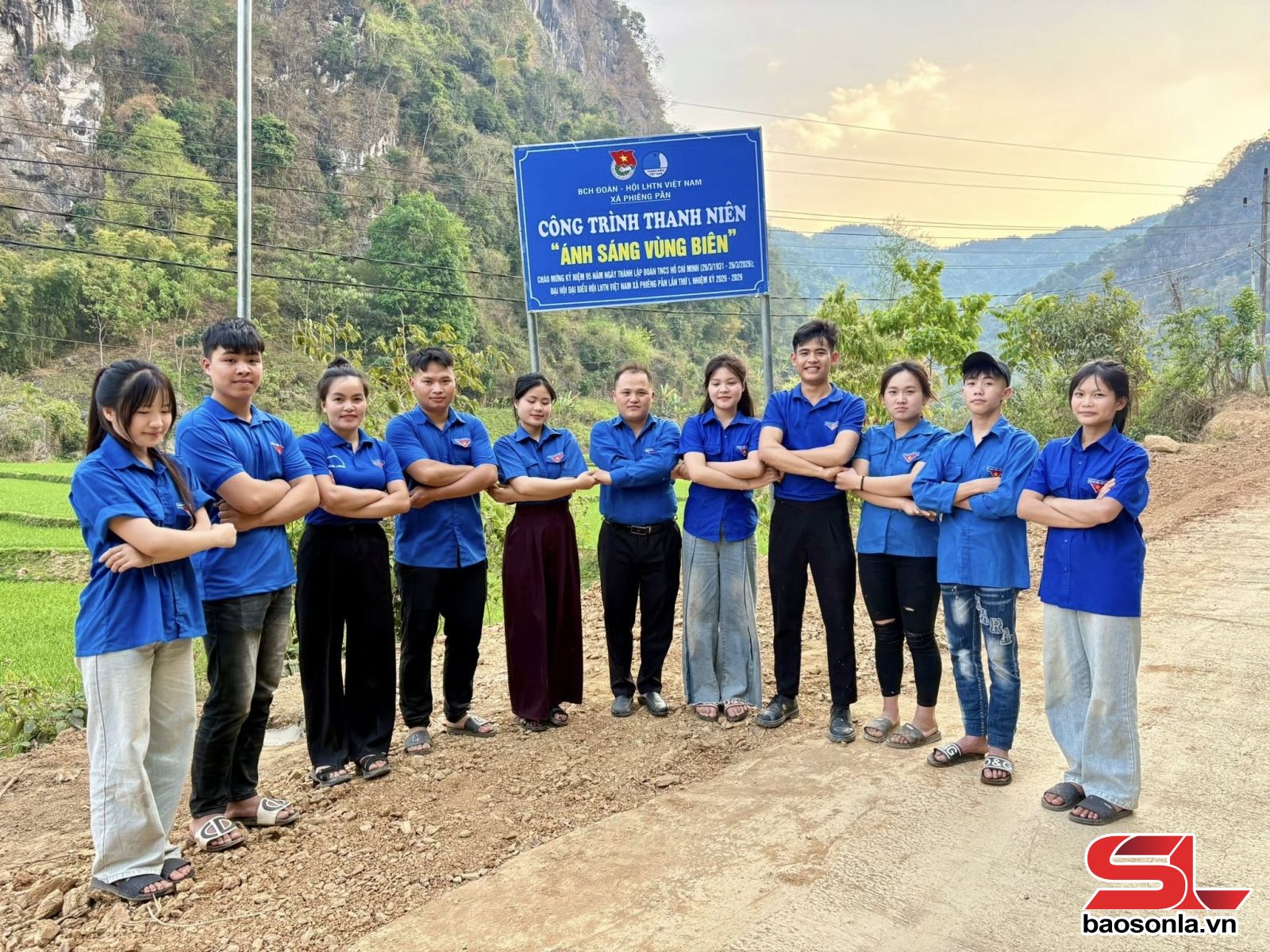 Anh Giàng A Lạnh (đứng giữa) cùng đoàn viên xã khánh thành công trình thanh niên “Ánh sáng vùng biên” tại bản Oi, xã Phiêng Pằn.
