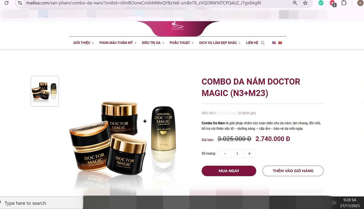 Theo tìm hiểu, combo Da Nám Doctor Magic (N3+M23) có giá bán trên https://mailisa.com hơn 3 triệu đồng, giảm giá còn 2,74 triệu đồng. Sản phẩm được mailisa quảng cáo là “bộ kem dưỡng hỗ trợ cải thiện da nám, tàn nhang, đồi mồi và kem hỗ trợ bảo vệ da trước ánh nắng mặt trời – làm đẹp da..., là giải pháp chăm sóc toàn diện cho da nám, tàn nhang, đồi mồi…”.