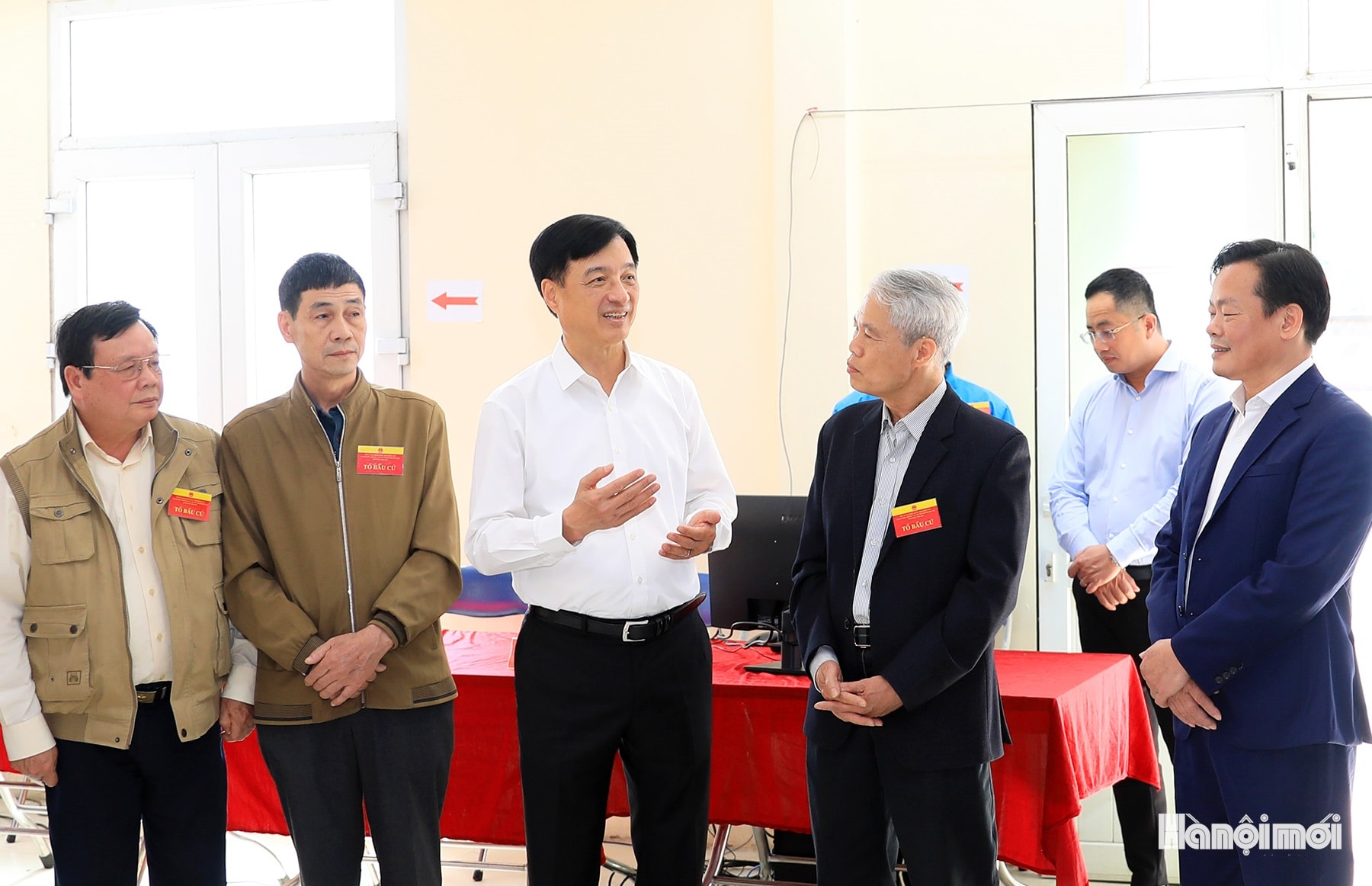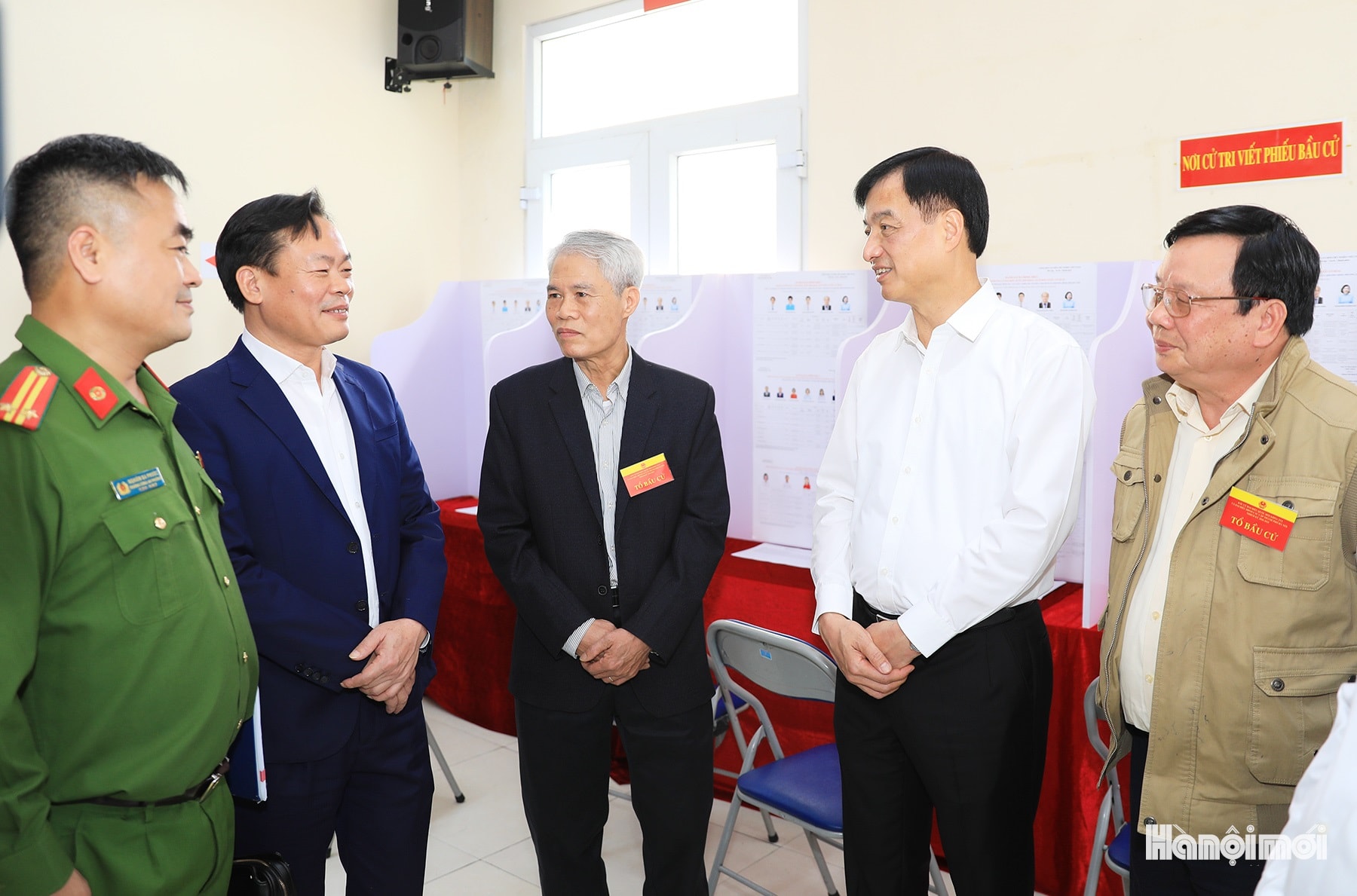 Bí thư Thành ủy Hà Nội Nguyễn Duy Ngọc trao đổi với thành viên tổ bầu cử số 50.