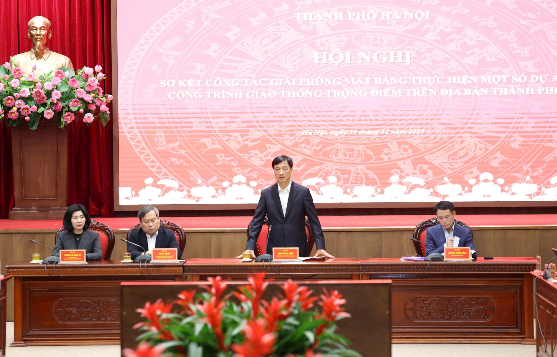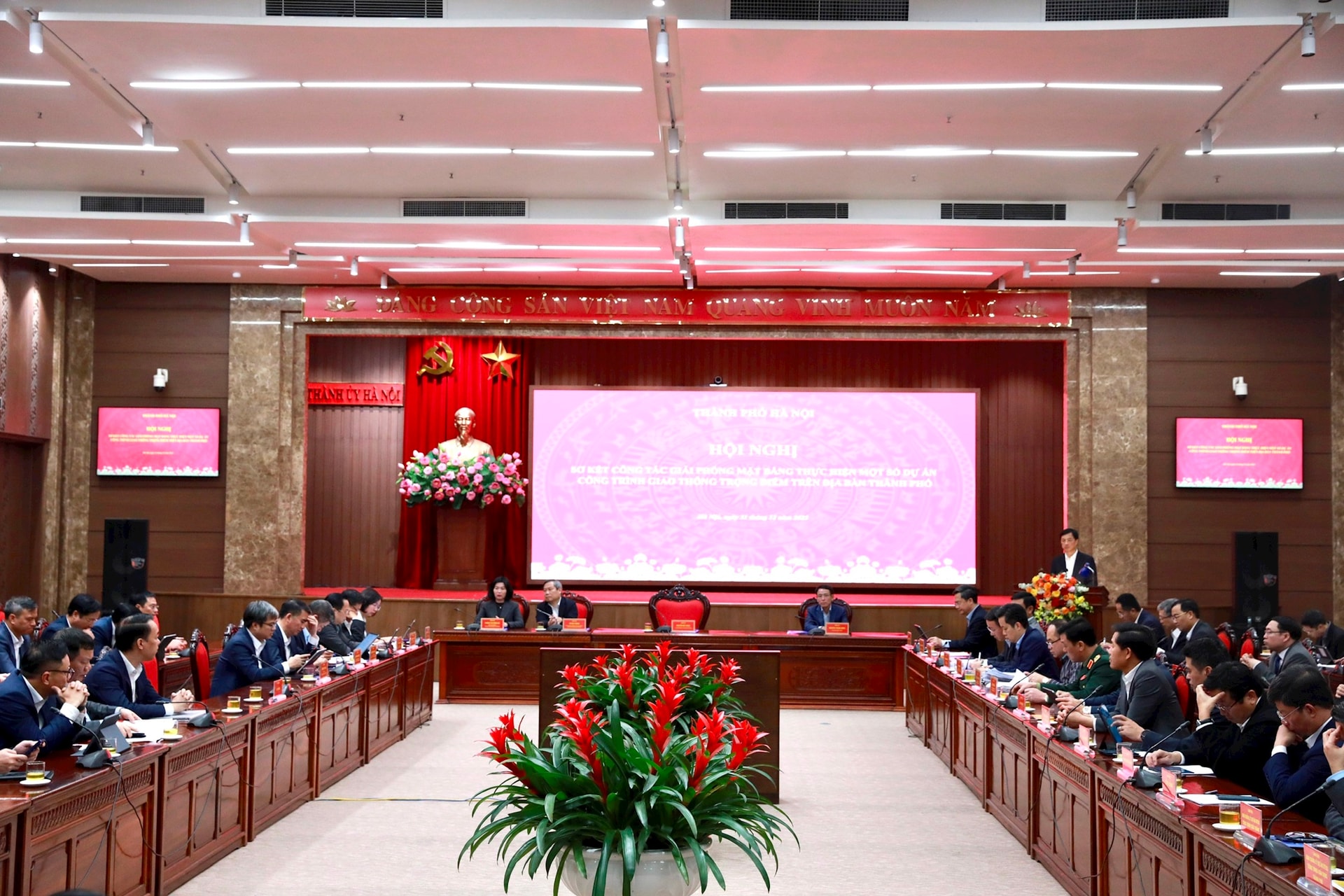 Chủ trì hội nghị có các đồng chí: Ủy viên Bộ Chính trị, Bí thư Thành ủy Nguyễn Duy Ngọc; Ủy viên Trung ương Đảng, Phó Bí thư Thành ủy, Chủ tịch UBND thành phố Vũ Đại Thắng; Phó Bí thư Thành ủy, Chủ tịch HĐND thành phố Phùng Thị Hồng Hà; Phó Bí thư Thành ủy Nguyễn Trọng Đông.