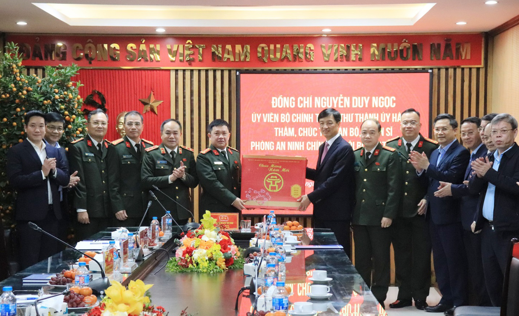 Phát biểu tại buổi thăm, chúc Tết, đồng chí Nguyễn Duy Ngọc ghi nhận, biểu dương và đánh giá cao những kết quả, thành tích mà cán bộ, chiến sĩ Phòng An ninh chính trị nội bộ đã đạt được trong thời gian qua. "Các đồng chí đã bảo đảm an ninh tuyệt đối trên từng lĩnh vực, ở từng thời điểm, chủ động nắm bắt thông tin để báo cáo kịp thời cho lãnh đạo Bộ, lãnh đạo Thành phố và Trung ương," Bí thư Thành ủy đánh giá.