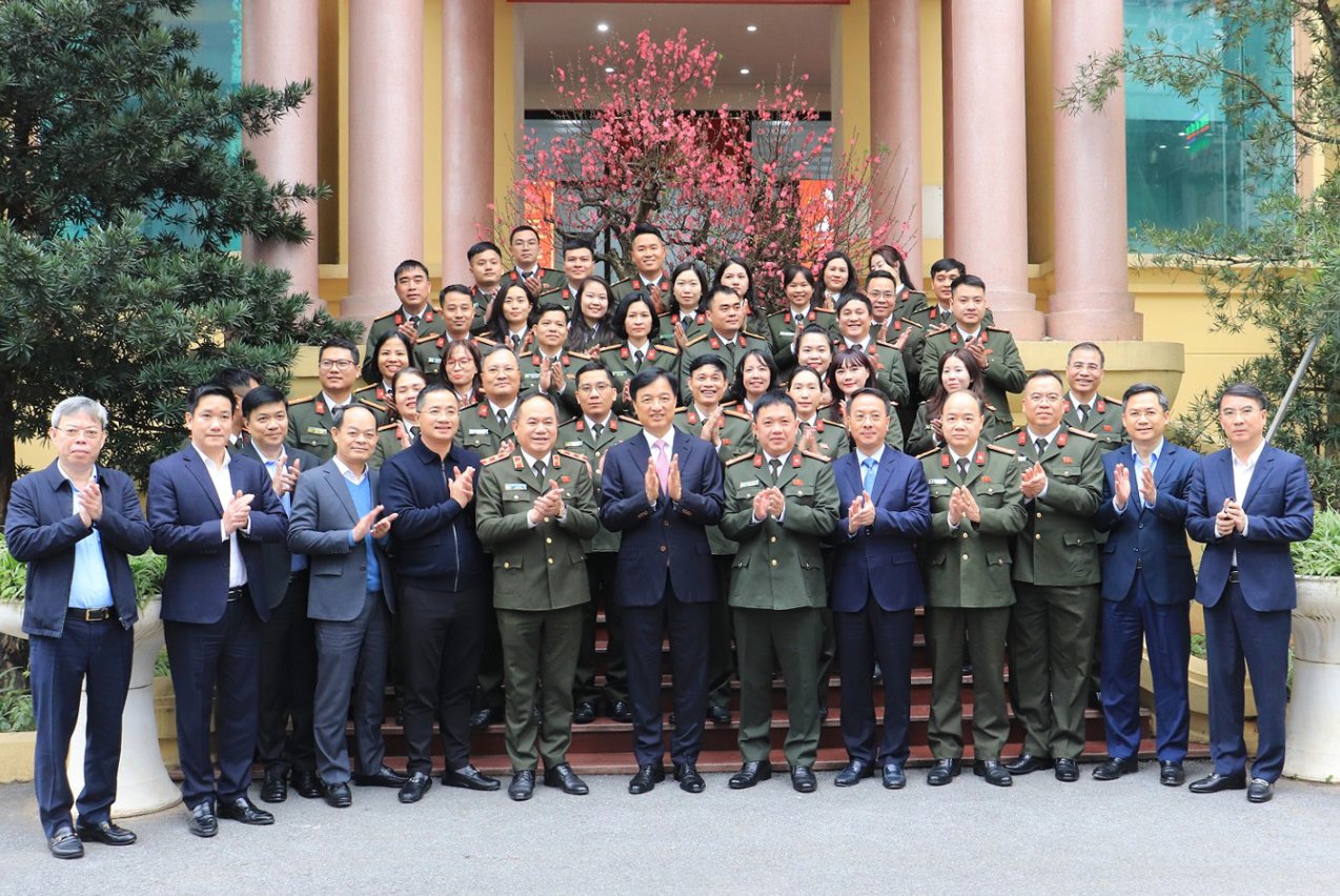 Đồng chí Nguyễn Duy Ngọc, Trung tướng Nguyễn Thanh Tùng cùng đoàn công tác và Ban chỉ huy, cán bộ, chiến sỹ Phòng An ninh chính trị nội bộ CATP chụp ảnh lưu niệm