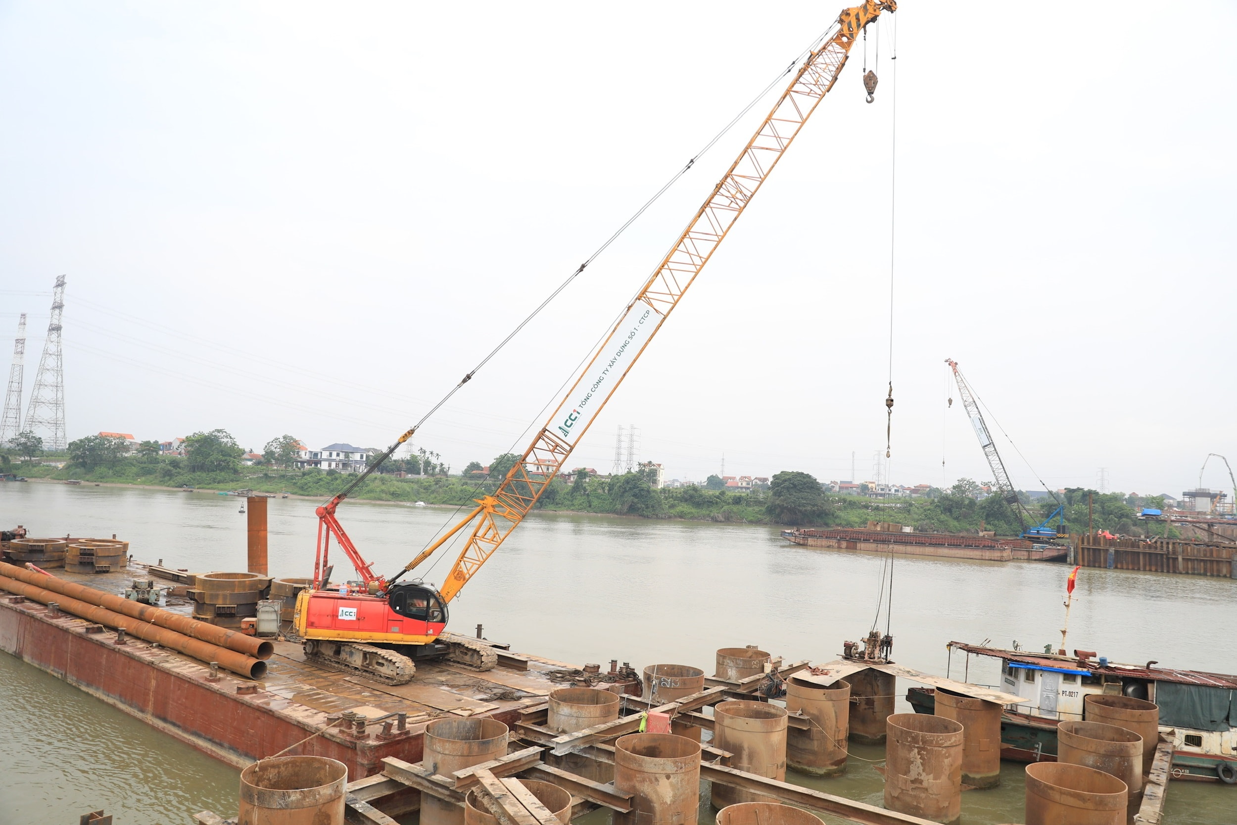 Thi công dự án cầu Mễ Sở. Ảnh Quang Thái