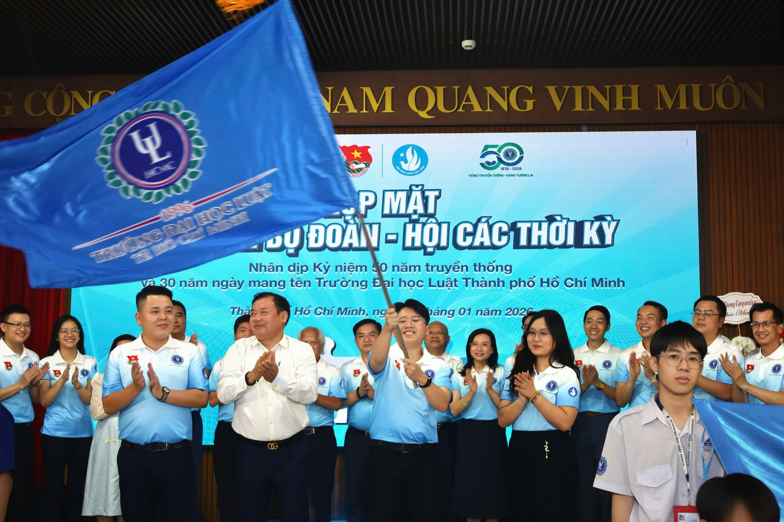 Nguyên Bí thư Đoàn trường, nguyên Chủ tịch Hội Sinh viên trường các thời kỳ trao lại lá cờ truyền thống cho thế hệ đương nhiệm. Ảnh: CẨM NƯƠNG