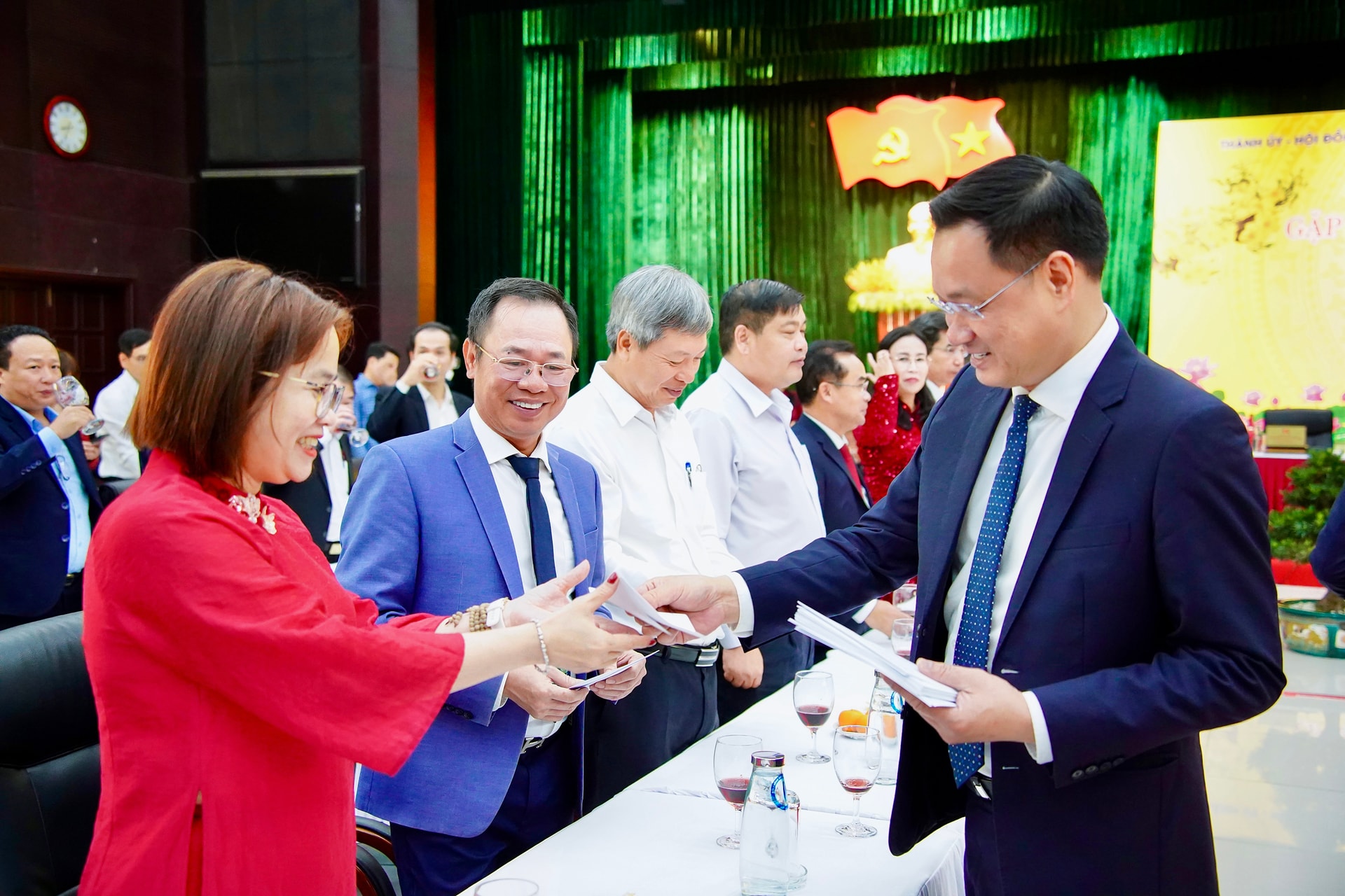 Ủy viên Trung ương Đảng, Bí thư Thành ủy Lê Ngọc Quang; Ủy viên Trung ương Đảng, Phó Bí thư Thành ủy, Chủ tịch UBND thành phố Phạm Đức Ấn; Phó Bí thư Thường trực Thành ủy Nguyễn Đình Vĩnh; Phó Bí thư Thành ủy, Chủ tịch HĐND thành phố Nguyễn Đức Dũng; Phó Bí thư Thành ủy Ngô Xuân Thắng đồng chủ trì gặp mặt.