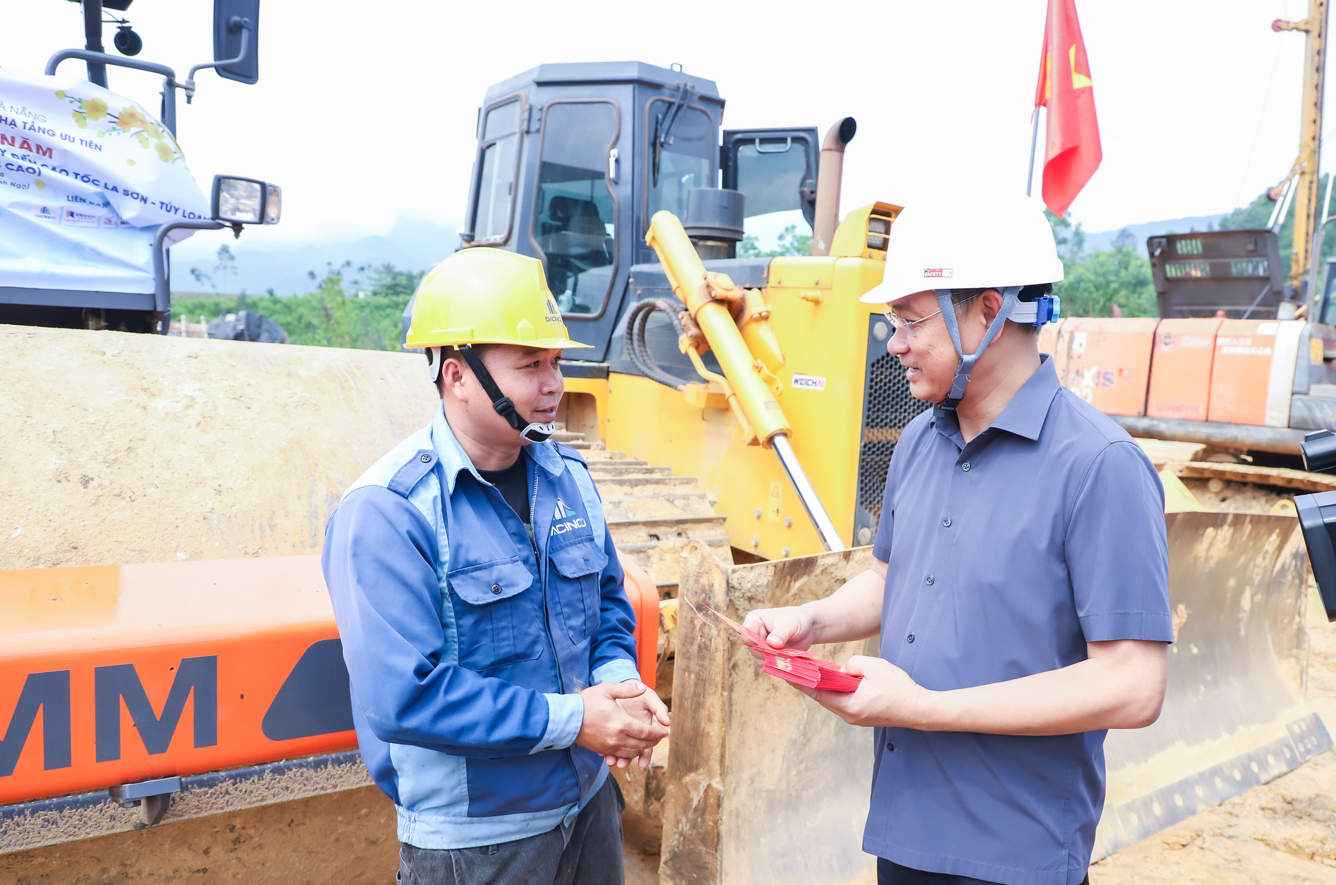 Bí thư Thành ủy Lê Ngọc Quang lì xì động viên công nhân thi công tại công trường. Ảnh: NGỌC PHÚ