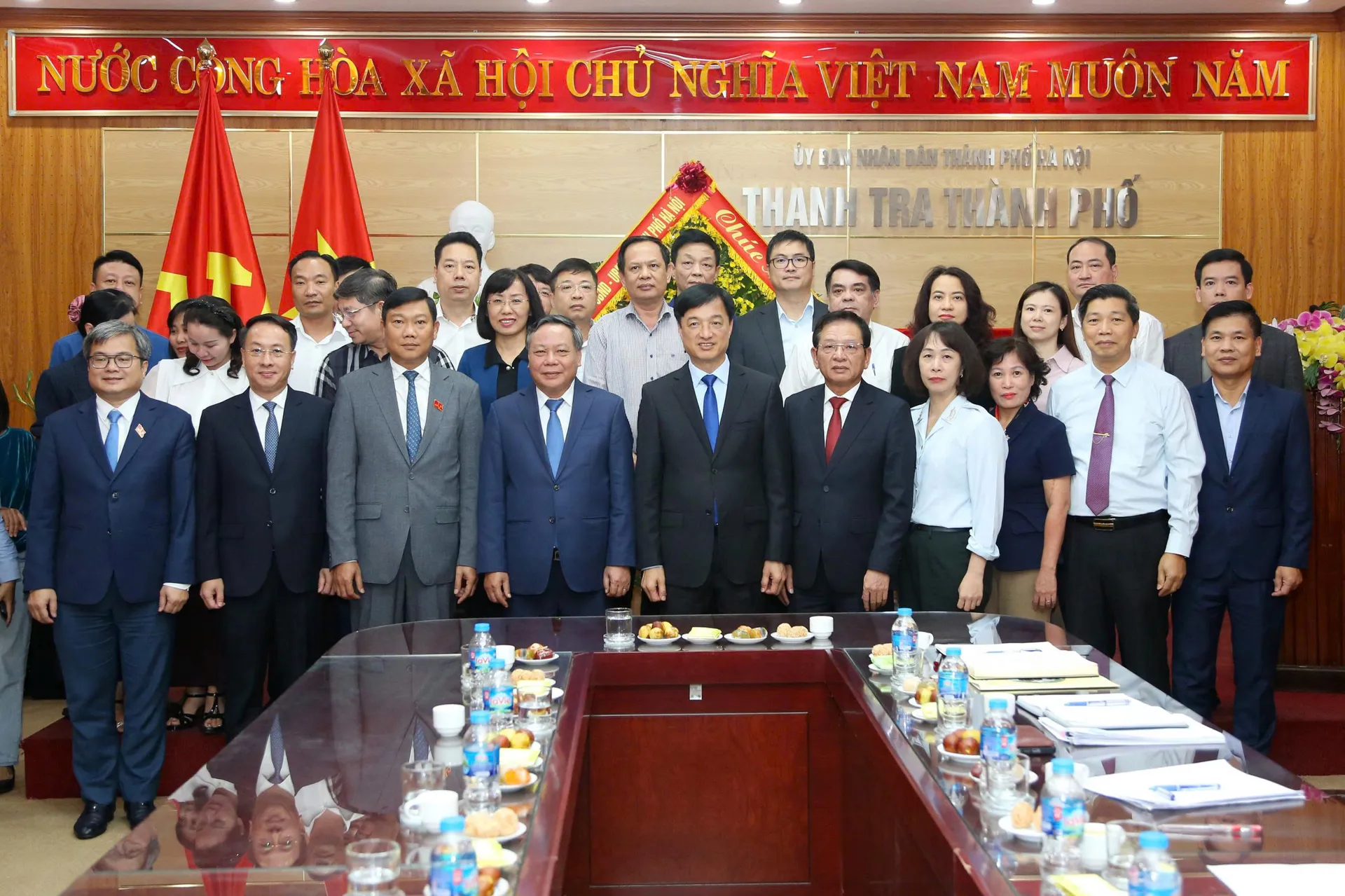 Bí thư Thành ủy Hà Nội Nguyễn Duy Ngọc cùng các đồng chí lãnh đạo thành phố chụp ảnh lưu niệm cùng cán bộ, nhân viên Thanh tra thành phố Hà Nội.