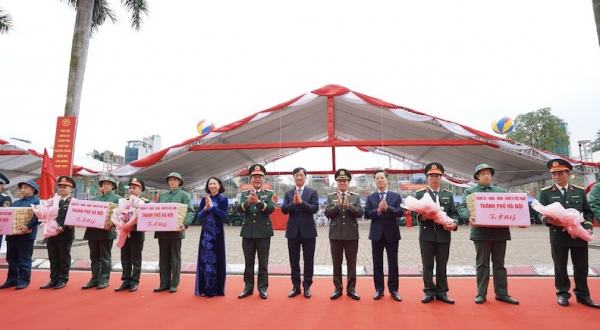 Bí thư Thành ủy Hà Nội Nguyễn Duy Ngọc và các đồng chí lãnh đạo TP Hà Nội tặng quà động viên tân binh lên đường nhập ngũ.