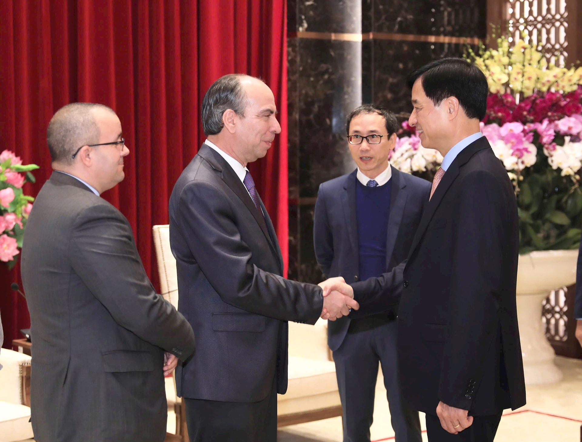 Bí thư Thành ủy Hà Nội Nguyễn Duy Ngọc (phải) đón tiếp Đại sứ Cuba Rogelio Polanco Fuentes. Ảnh: Quang Thái