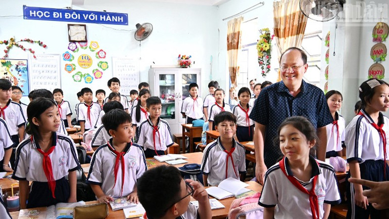 Đồng chí Nguyễn Hồ Hải, Bí thư Tỉnh ủy Cà Mau thăm lớp học của Trường tiểu học Lê Thị Riêng thuộc phường Bạc Liêu.
