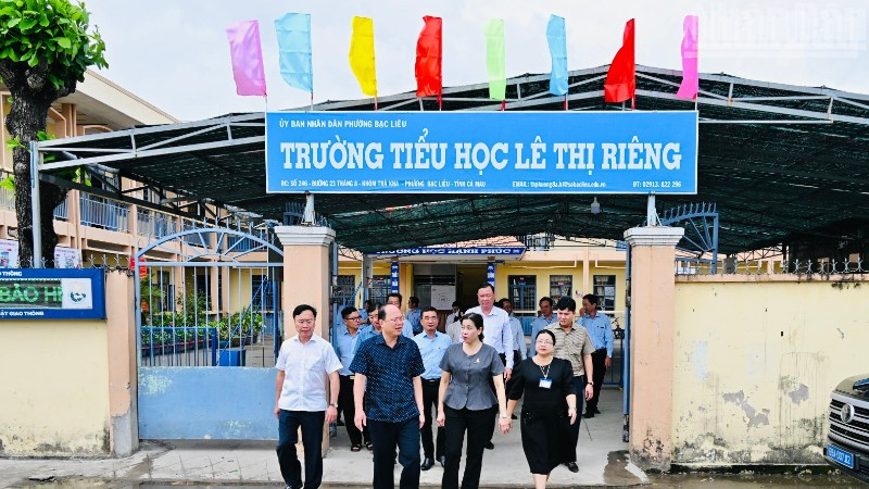 Đồng chí Nguyễn Hồ Hải, Bí thư Tỉnh ủy Cà Mau (áo xanh,giữa) và Đoàn công tác đến thăm Trường tiểu học Lê Thị Riêng thuộc phường Bạc Liêu.