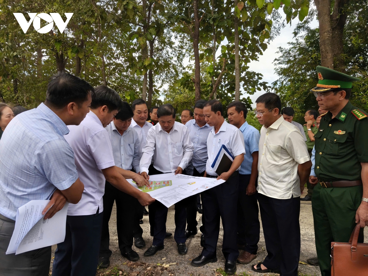 Bí thư Tỉnh ủy Đắk Lắk (áo trắng tay dài) khảo sát điểm xây trường bán trú tại xã Buôn Đôn
