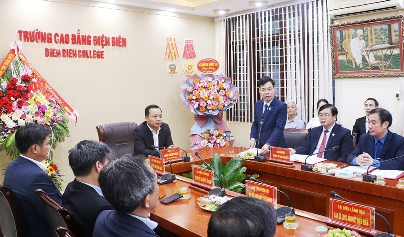 Bí thư Tỉnh ủy Điện Biên Trần Tiến Dũng cùng đoàn công tác tặng lẵng hoa chúc mừng Trường Cao đẳng Điện Biên. Ảnh Lan Phương