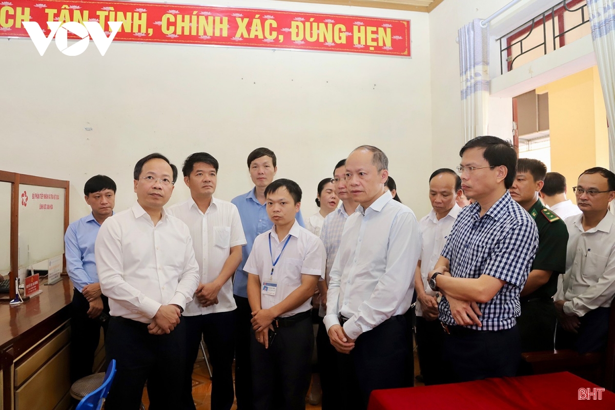 Bí thư Tỉnh ủy Nguyễn Duy Lâm (người hàng đầu, ngoài cùng bên trái) và đoàn công tác kiểm tra vận hành mô hình chính quyền địa phương 2 cấp tại xã Sơn Kim 2. Ảnh tư liệu.