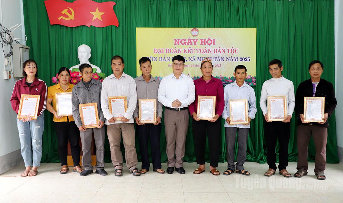 Đảng ủy xã Minh Tân trao chứng nhận cho các hộ tiêu biểu trong sản xuất kinh doanh thôn Bản Hình.