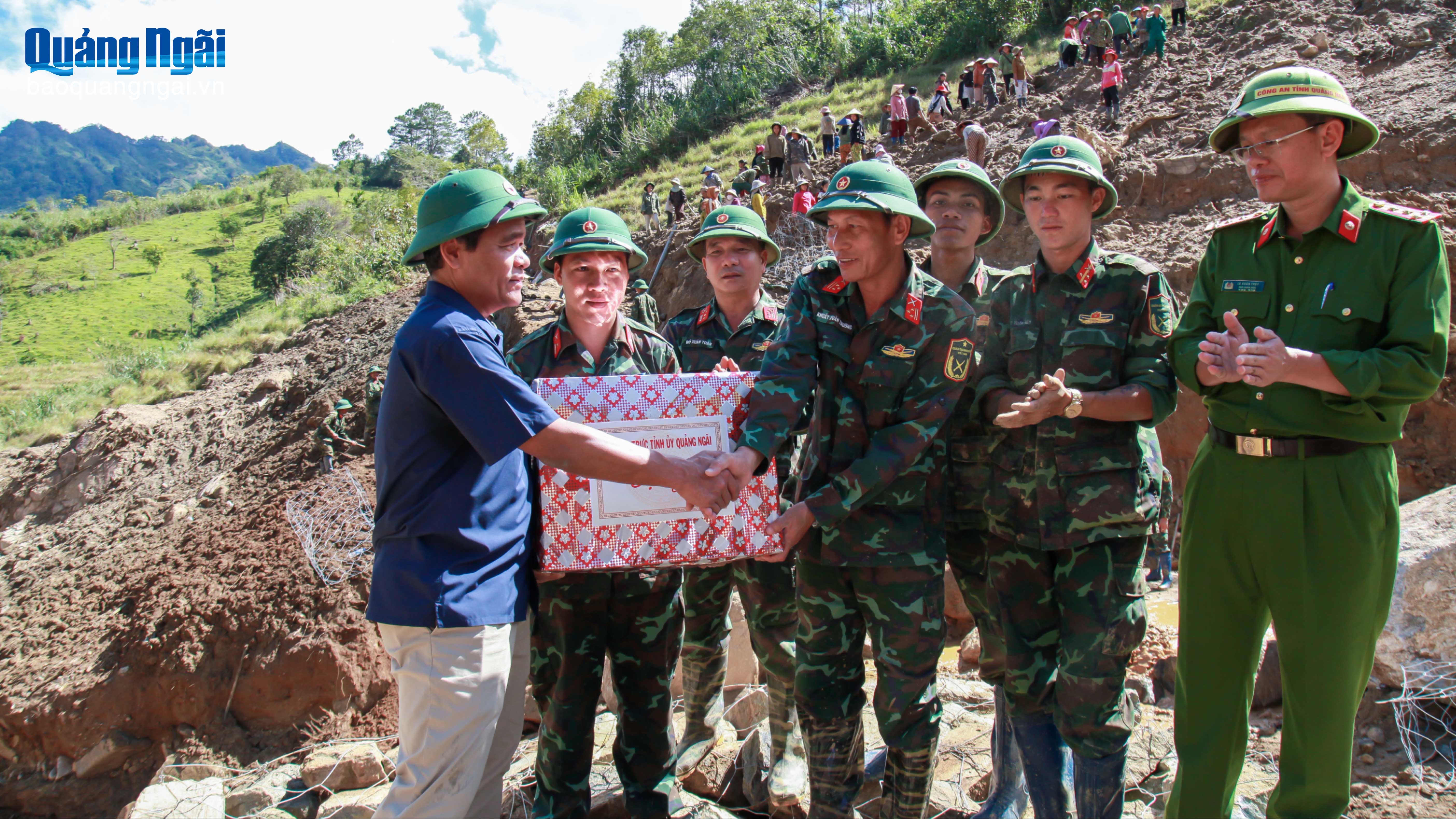 Bên cạnh đó, đồng chí Hồ Văn Niên đã đến thăm và động viên lực lượng vũ trang đang trực tiếp khắc phục hậu quả mưa bão tại các thôn trên địa bàn xã Ngọc Linh.