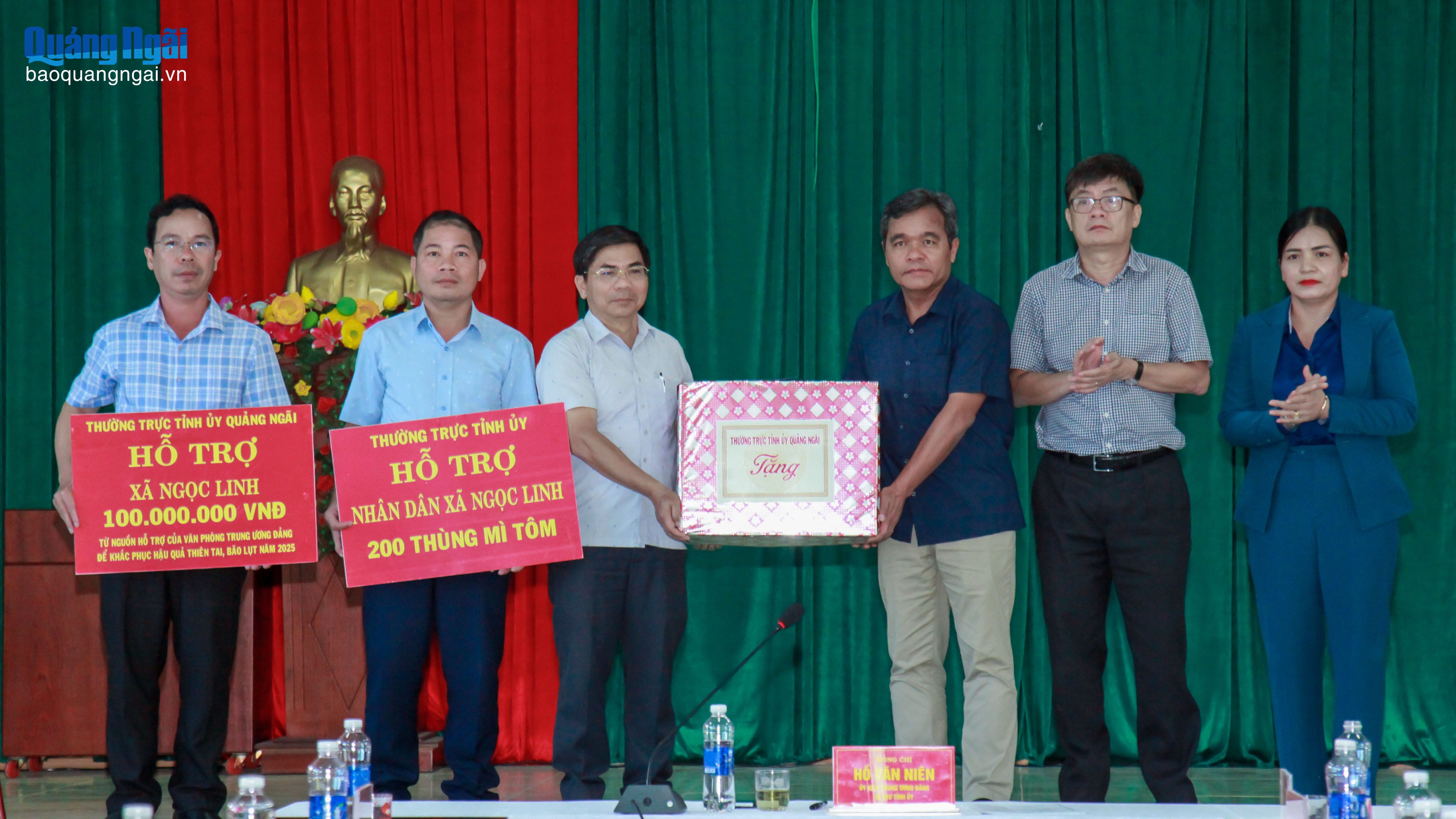 Dịp này, đồng chí Hồ Văn Niên trao 100 triệu đồng từ nguồn hỗ trợ của Văn phòng Trung ương Đảng và quà của Thường trực Tỉnh ủy cho người dân xã Ngọc Linh.