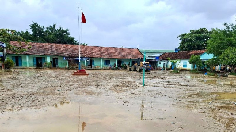 Trường Trung học cơ sở Trịnh Phong, xã Diên Khánh vẫn đang dọn dẹp bùn đất sáng 25/11.
