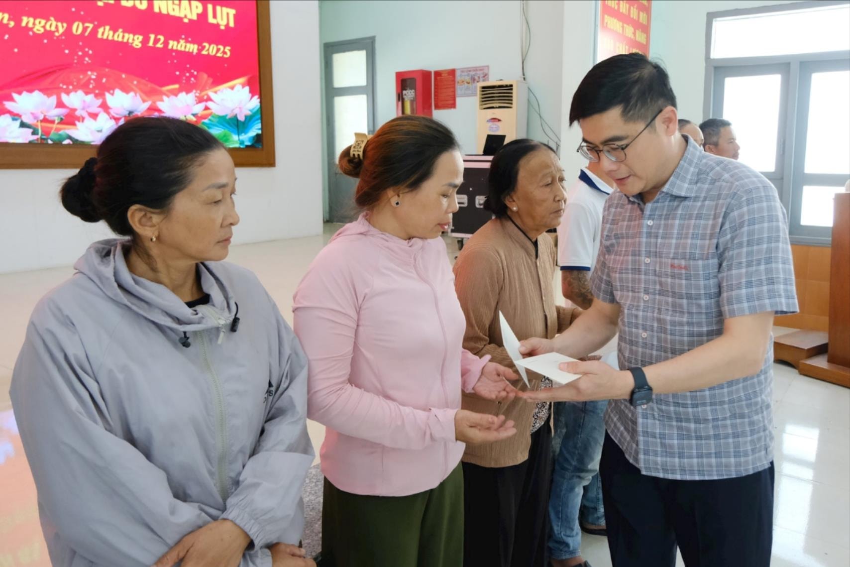 Nhằm chia sẻ khó khăn với người dân vùng thiên tai, đoàn công tác đã trao tặng 2 tấn gạo hỗ trợ xã Hàm Thuận; đồng thời, gửi 25 phần quà đến các hộ thiệt hại nặng do ngập lụt.