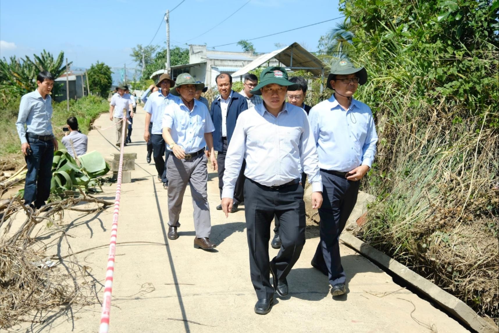 Các đồng chí lãnh đạo tỉnh đi kiểm tra thực tế tình hình thiệt hại do mưa lũ trên địa bàn xã Hàm Thuận