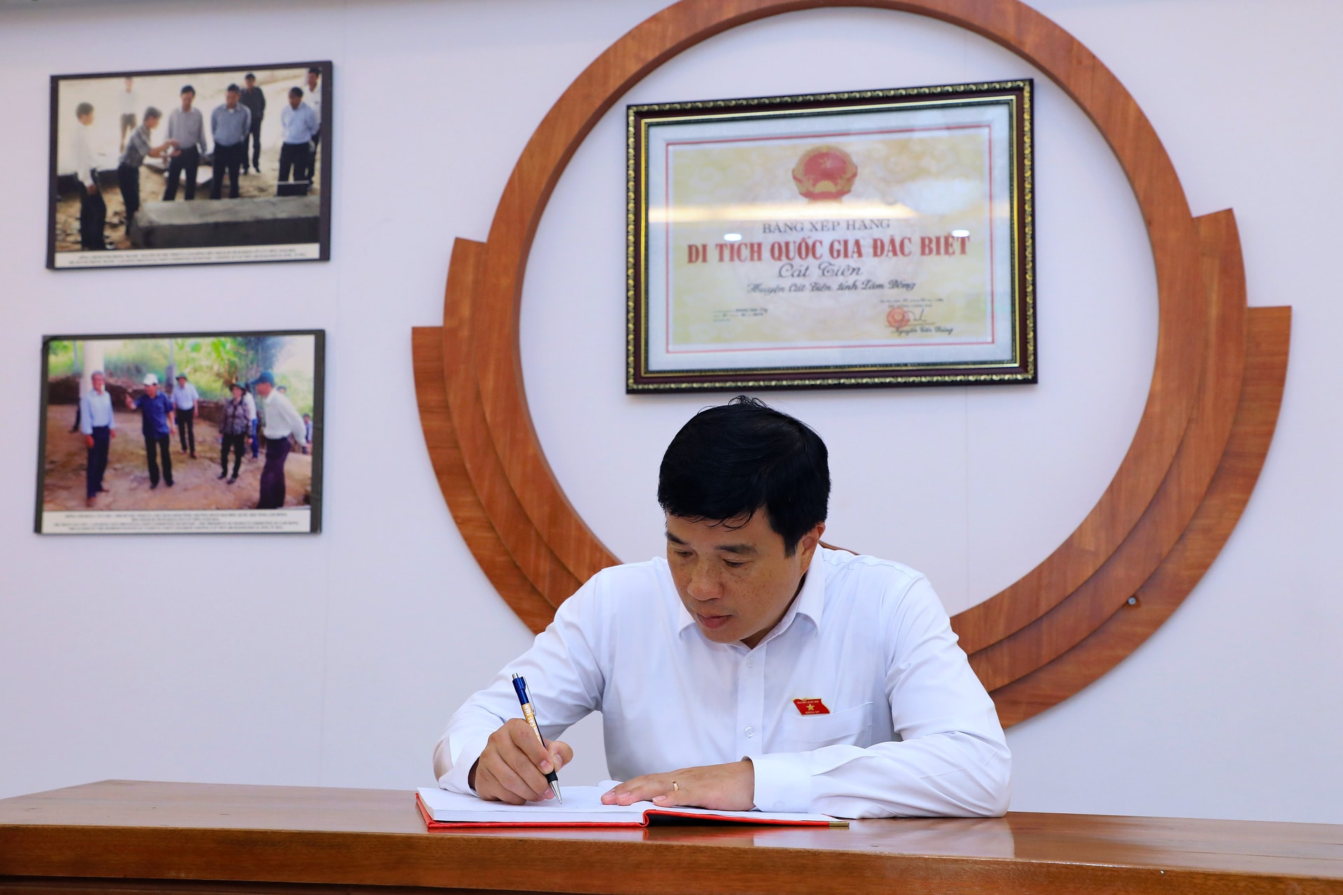 Bí thư Tỉnh ủy Lâm Đồng Y Thanh Hà Niê Kđăm ghi vào sổ lưu niệm tại Khu di tích quốc gia đặc biệt Cát Tiên