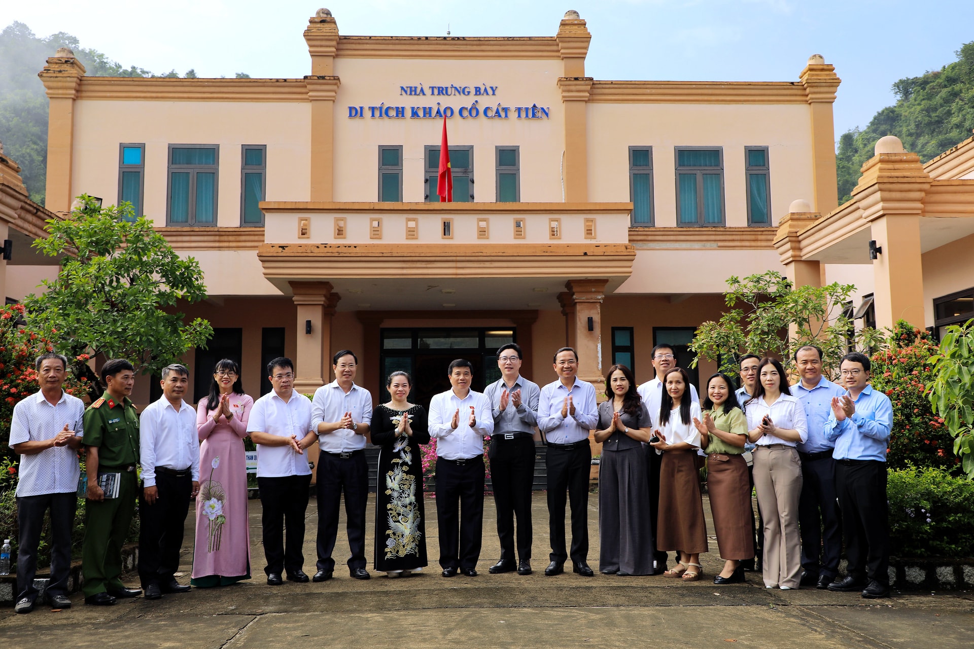 Đoàn công tác của tỉnh Lâm Đồng chụp hình lưu niệm tại nhà trưng bày Di tích khảo cổ Cát Tiên