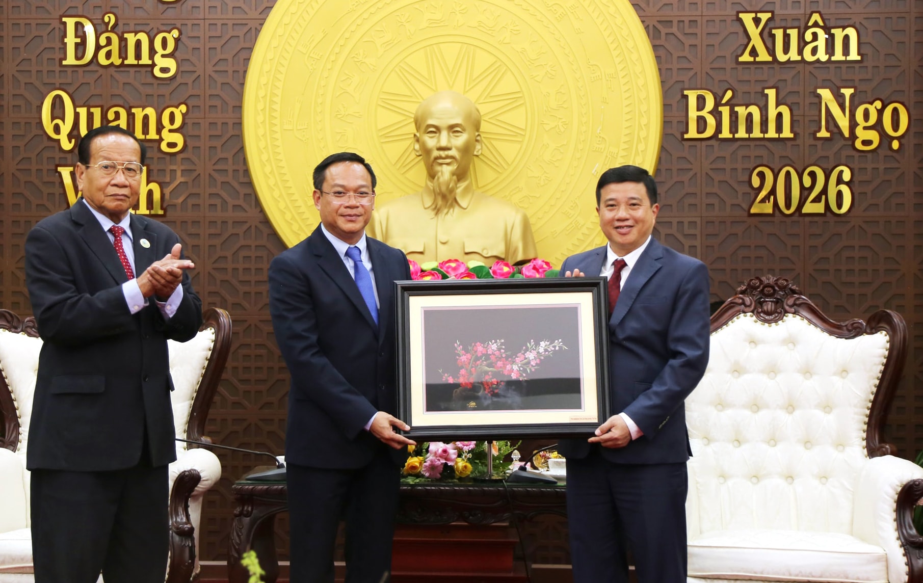 Đồng chí Y Thanh Hà Niê Kđăm, Ủy viên Ban chấp hành Trung ương Đảng, Bí thư Tỉnh ủy, Trưởng Đoàn ĐBQH tỉnh Lâm Đồng tặng bức tranh lưu niệm với nhiều ý nghĩa cho lãnh đạo tỉnh Mondulkiri