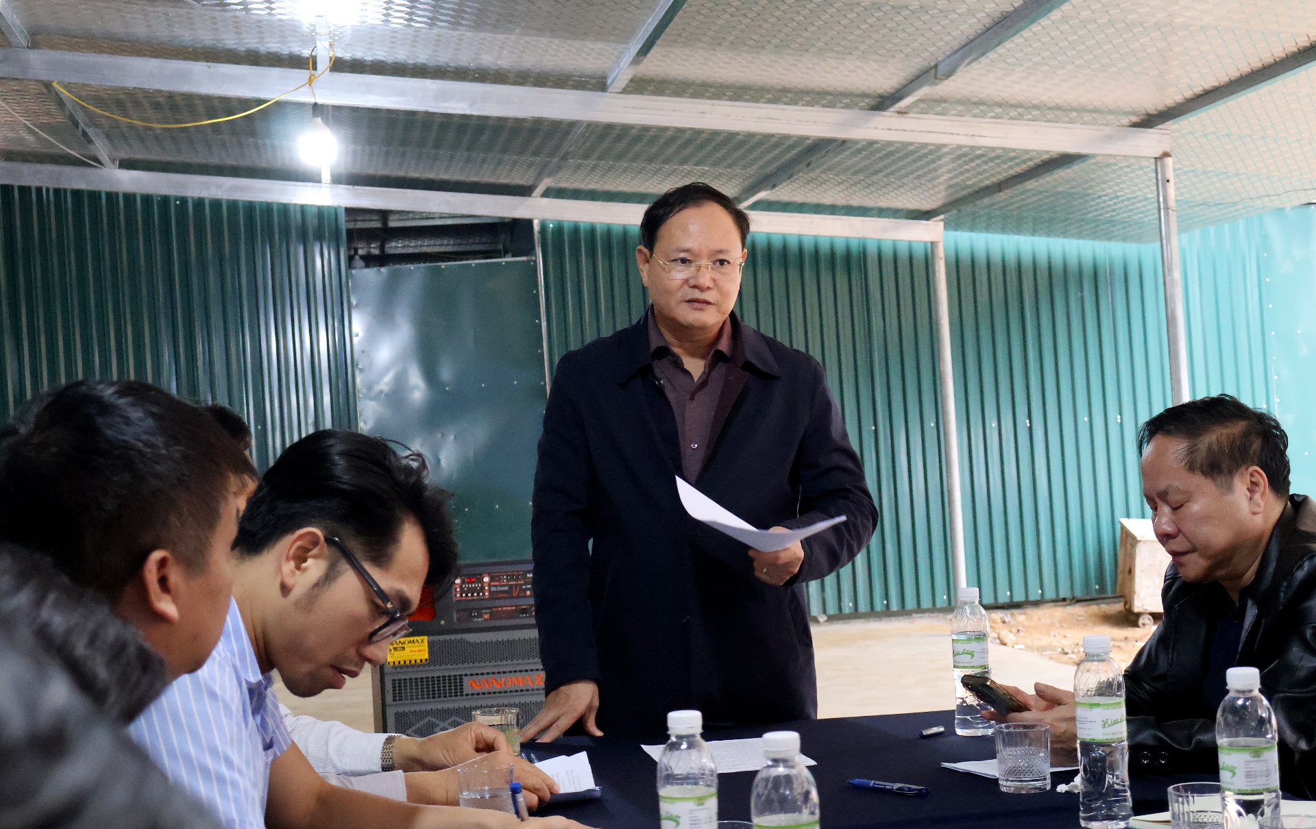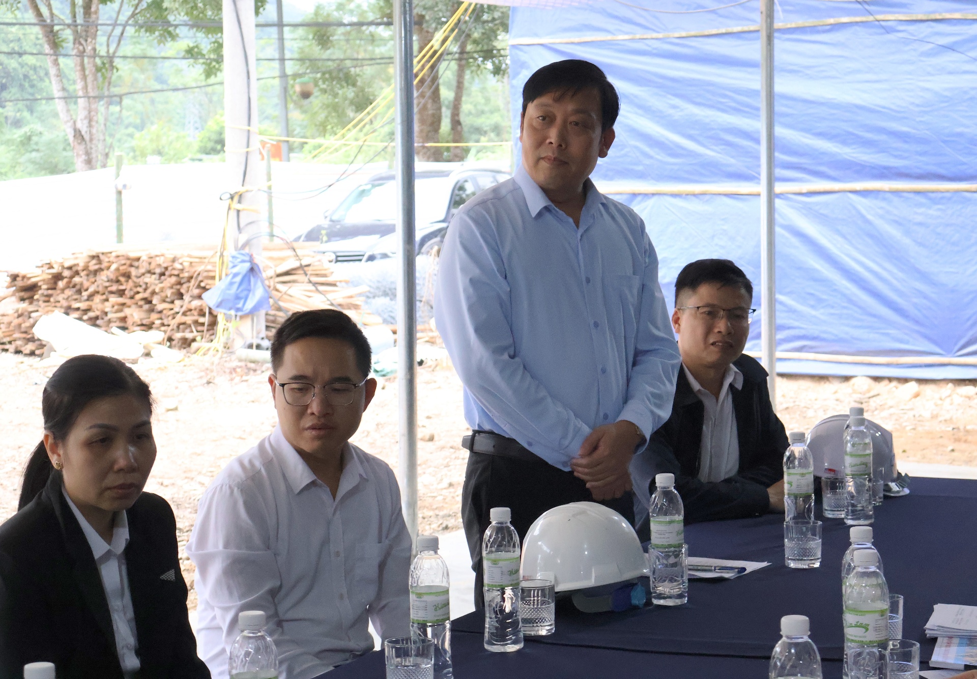 Đồng chí Bí thư Tỉnh ủy Lê Minh Ngân nghe đơn vị nhà thầu báo cáo tình hình thực hiện và quyết tâm hoàn thành dự án đảm bảo tiến độ, chất lượng.