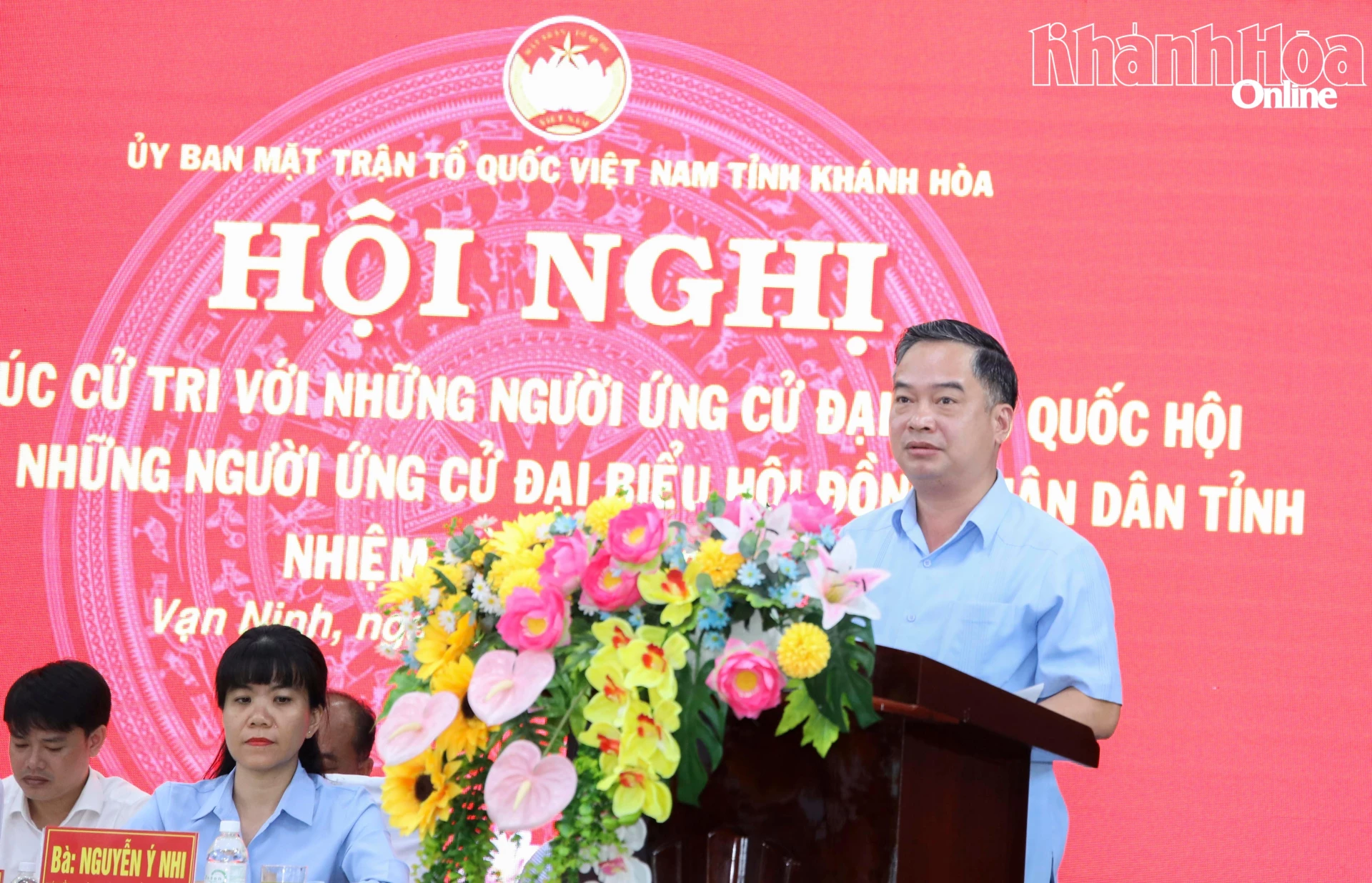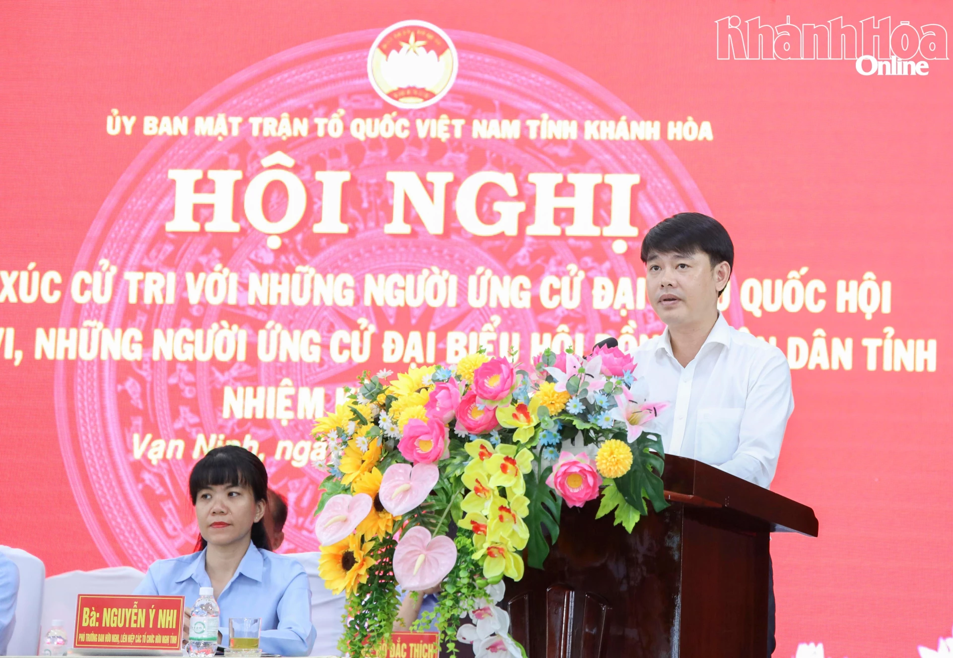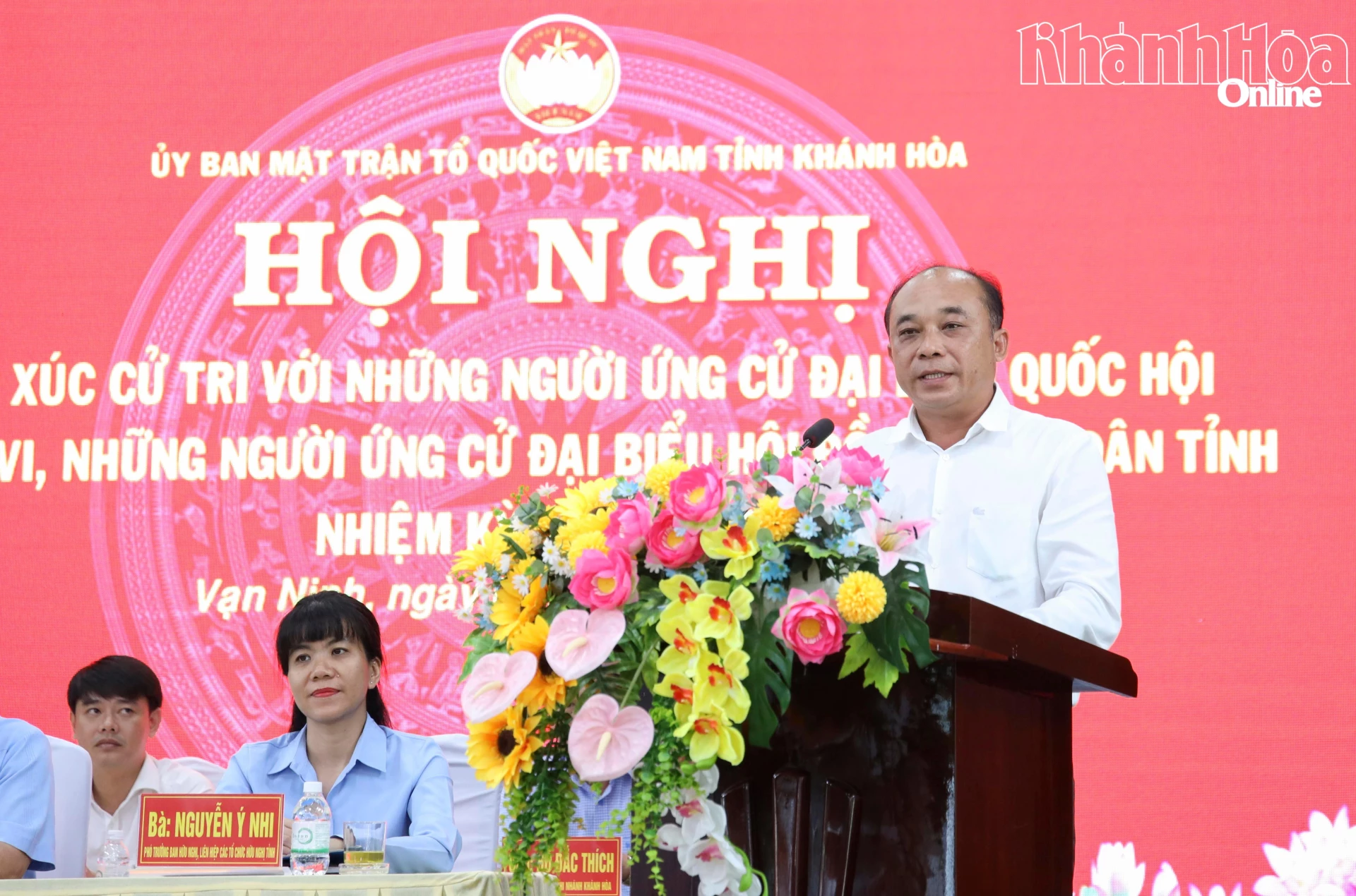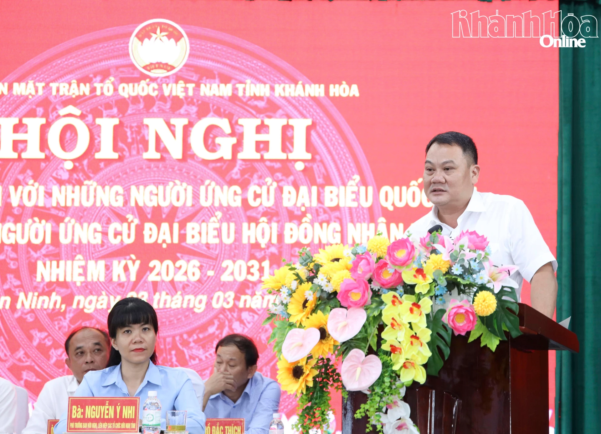 Tại hội nghị, đại diện Ủy ban MTTQ Việt Nam tỉnh đã thông tin tới cử tri tiểu sử tóm tắt của người ứng cử. Theo đó, đối với đại biểu Quốc hội khóa XVI, Đơn vị bầu cử số 1 có 5 người ứng cử gồm các ông, bà: Nghiêm Xuân Thành - Ủy viên Trung ương Đảng, Bí thư Tỉnh ủy; Phùng Đức Tiến - Thứ trưởng Bộ Nông nghiệp và Môi trường, Phó Chủ tịch Hội Thủy sản Việt Nam; Nguyễn Hữu Phước - Ủy viên Ban Thường vụ Tỉnh ủy, Giám đốc Công an tỉnh; Nguyễn Ý Nhi - Phó Trưởng ban Hữu nghị Liên hiệp các tổ chức hữu nghị tỉnh; Phạm Thị Hạ Quyên - Phó Chủ tịch Ủy ban MTTQ Việt Nam phường, Chủ tịch Hội Liên hiệp Phụ nữ phường Ninh Hòa.