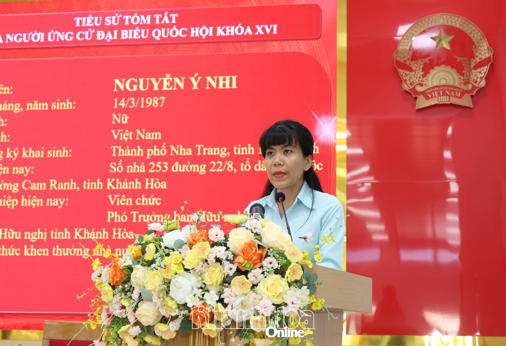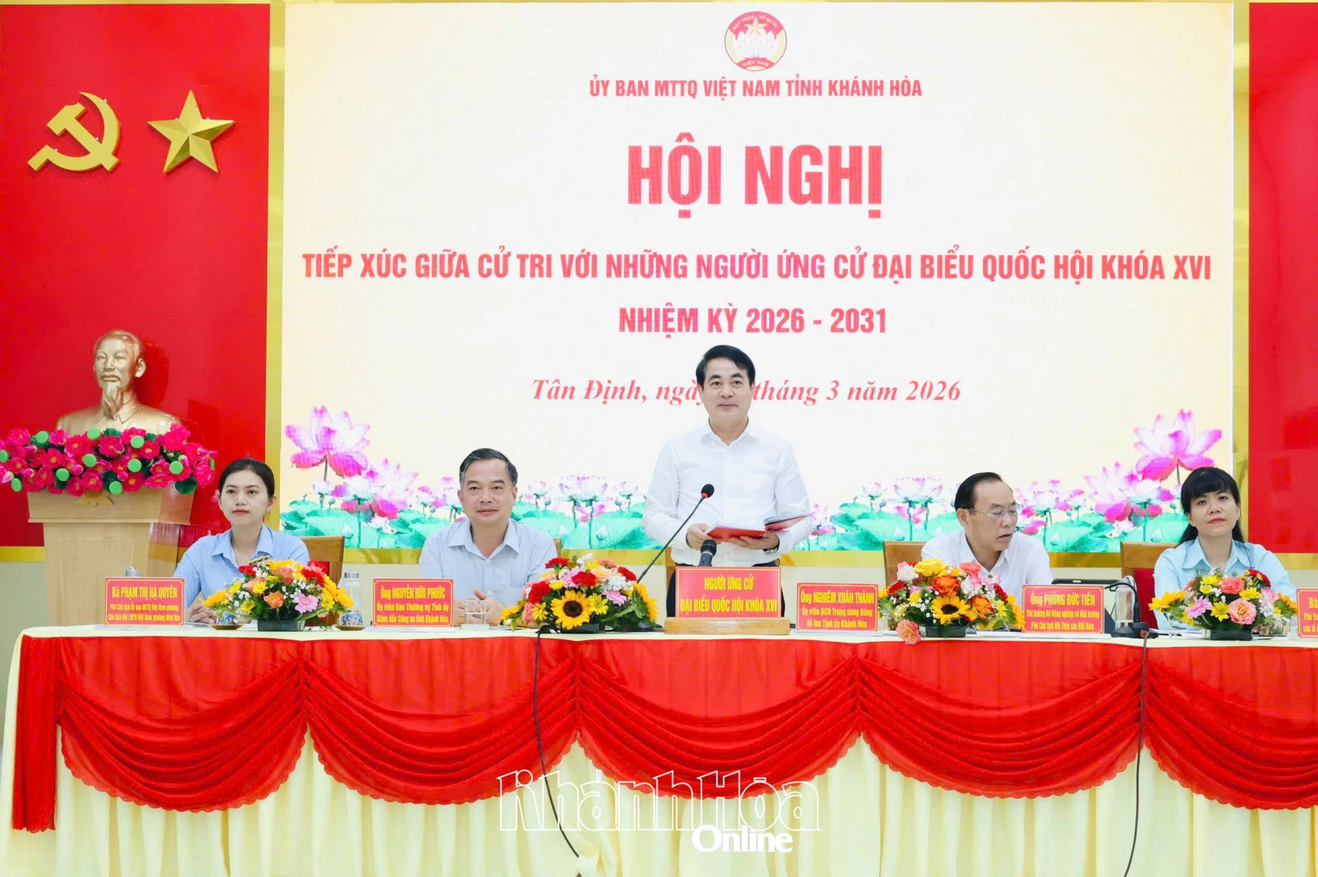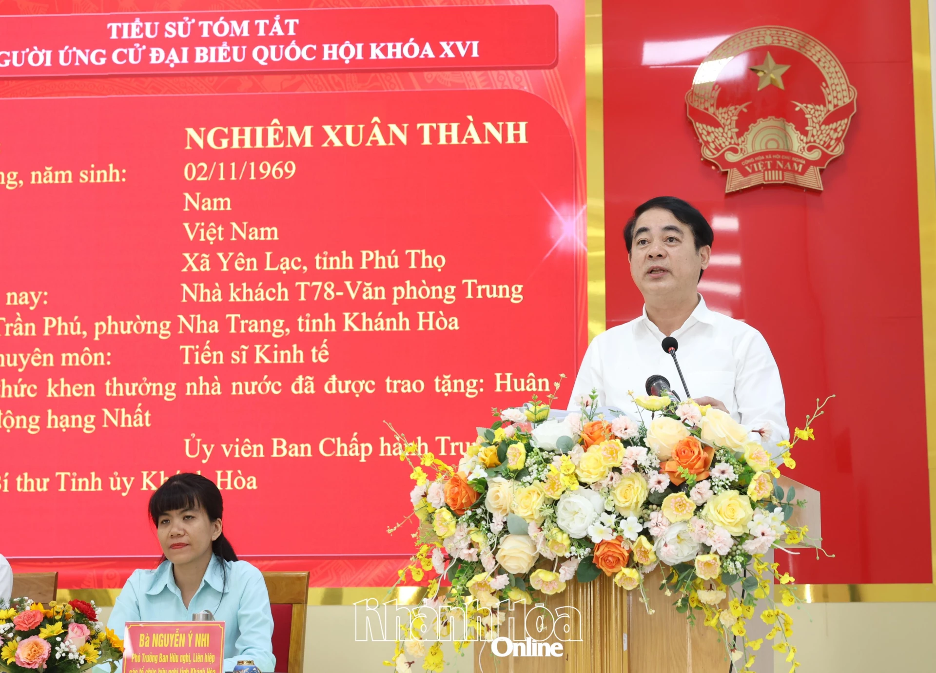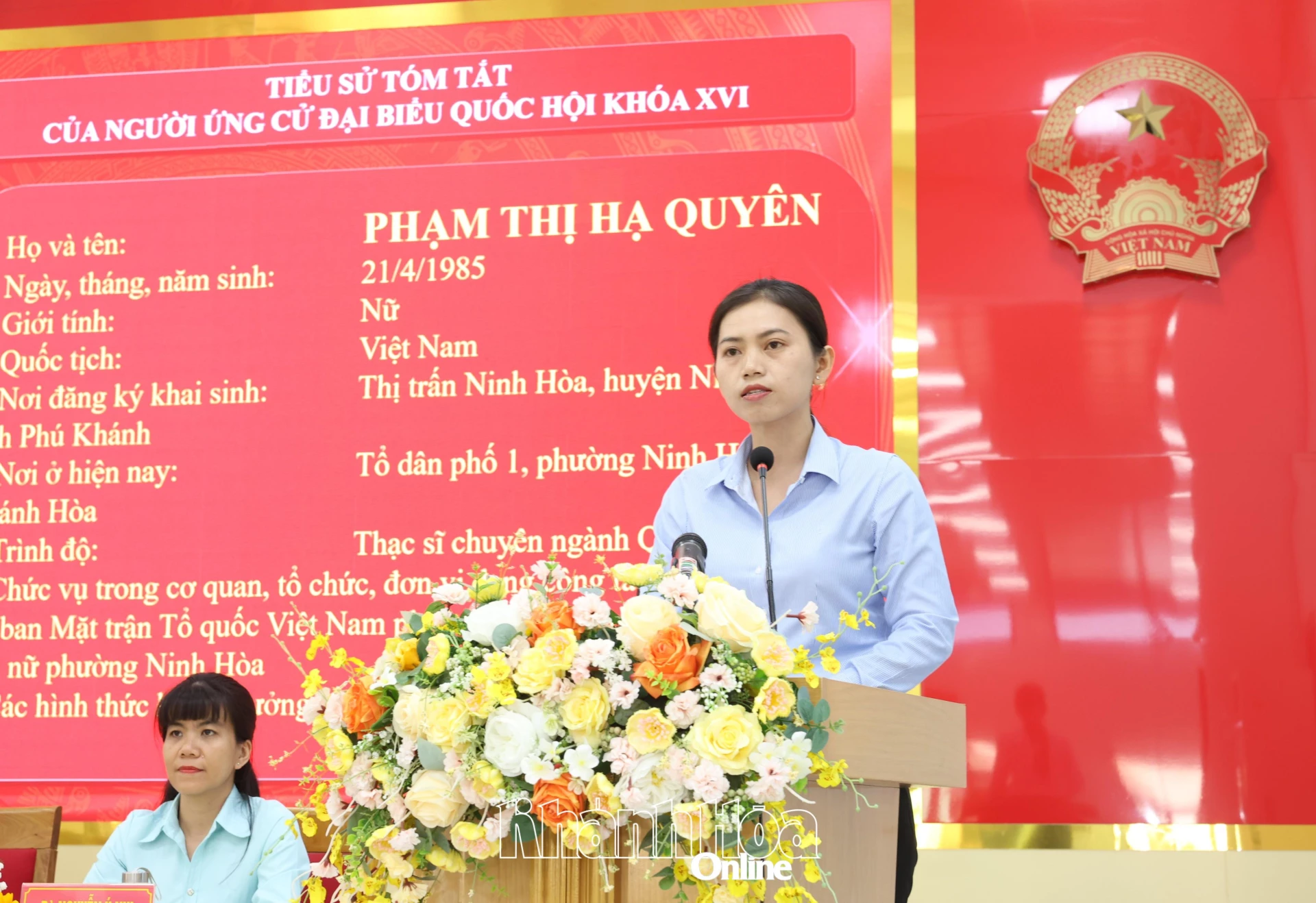 Tại hội nghị, đại diện Ban Thường trực Ủy ban MTTQ Việt Nam tỉnh thông tin tới cử tri tiểu sử tóm tắt của những người ứng cử đại biểu Quốc hội khóa XVI, Đơn vị bầu cử số 1, gồm các ông, bà: Nghiêm Xuân Thành - Ủy viên Trung ương Đảng, Bí thư Tỉnh ủy; Phùng Đức Tiến - Ủy viên Ban Thường vụ Đảng ủy, Thứ trưởng Bộ Nông nghiệp và Môi trường, Phó Chủ tịch Hội Thủy sản Việt Nam; Thiếu tướng Nguyễn Hữu Phước - Ủy viên Ban Thường vụ Tỉnh ủy, Bí thư Đảng ủy, Giám đốc Công an tỉnh; Phạm Thị Hạ Quyên - Phó Chủ tịch Ủy ban MTTQ Việt Nam phường, Chủ tịch Hội Liên hiệp Phụ nữ phường Ninh Hòa; Nguyễn Ý Nhi - Phó Trưởng ban Hữu nghị, Liên hiệp Các tổ chức hữu nghị tỉnh.