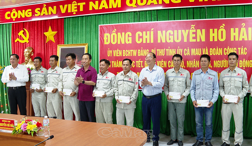 Bí thư Tỉnh ủy Nguyễn Hồ Hải, Chủ tịch UBND tỉnh Lữ Quang Ngời và Phó Chủ tịch Thường trực UBND tỉnh Lâm Văn Bi tặng quà cán bộ, nhân viên, người lao động đang thực hiện nhiệm vụ tại Dự án đường bộ cao tốc đoạn Cà Mau - Cái Nước.