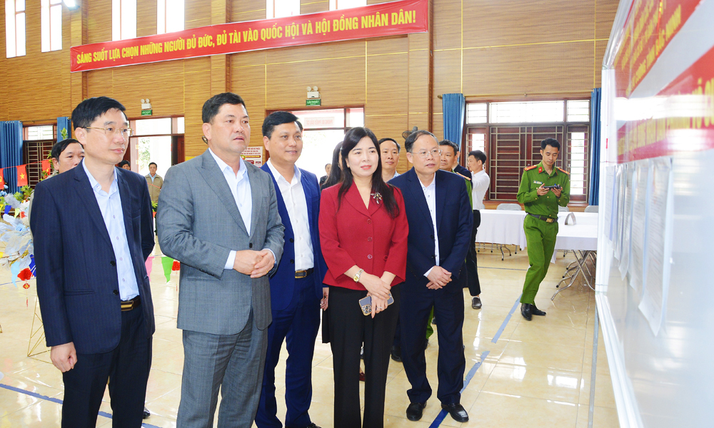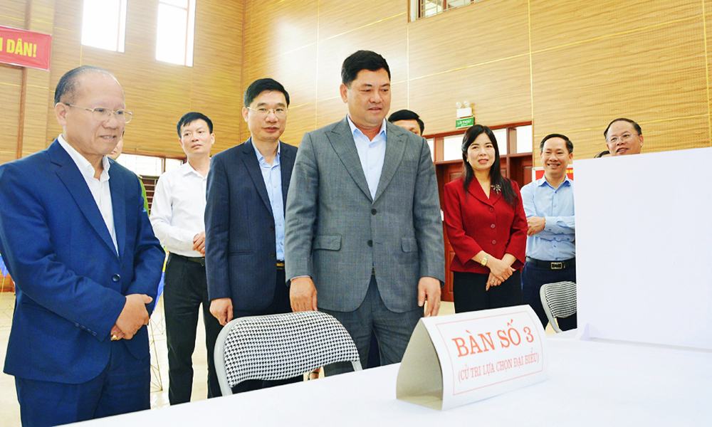 Bí thư Tỉnh ủy Nguyễn Hồng Thái kiểm tra khu vực bàn ghi phiếu bầu của cử tri tại tổ dân phố 1.