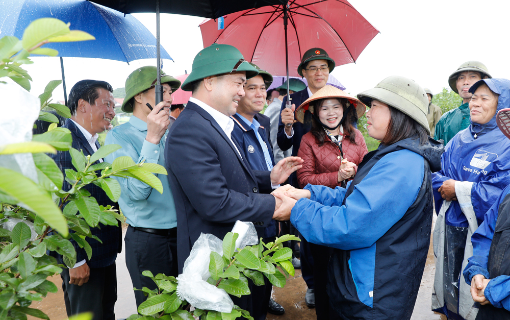 Đồng chí Bí thư Tỉnh ủy thăm hỏi, động viên bà con vùng sản xuất ổi lê tại thôn Hòa Minh, xã Phúc Hòa.