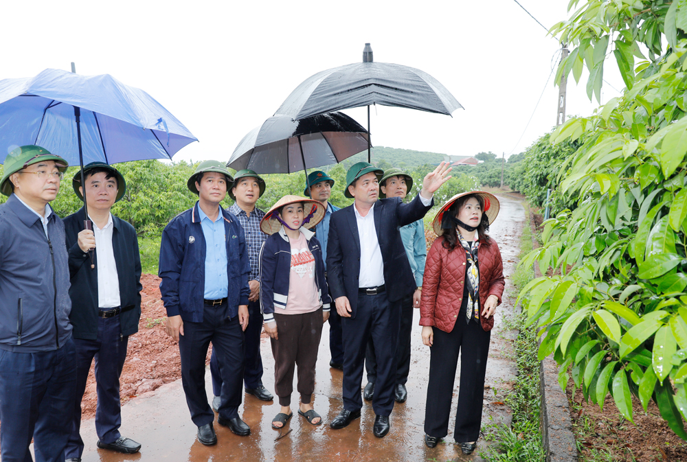 Đồng chí Nguyễn Hồng Thái cùng đoàn công tác thăm vùng sản xuất vải sớm xuất khẩu ở thôn Quất Du 2.
