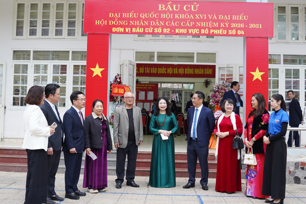 Bí thư Tỉnh ủy Phan Thăng An và các đại biểu, cử tri dự lễ khai mạc bầu cử tại đơn vị bầu cử số 2, phường Thục Phán.