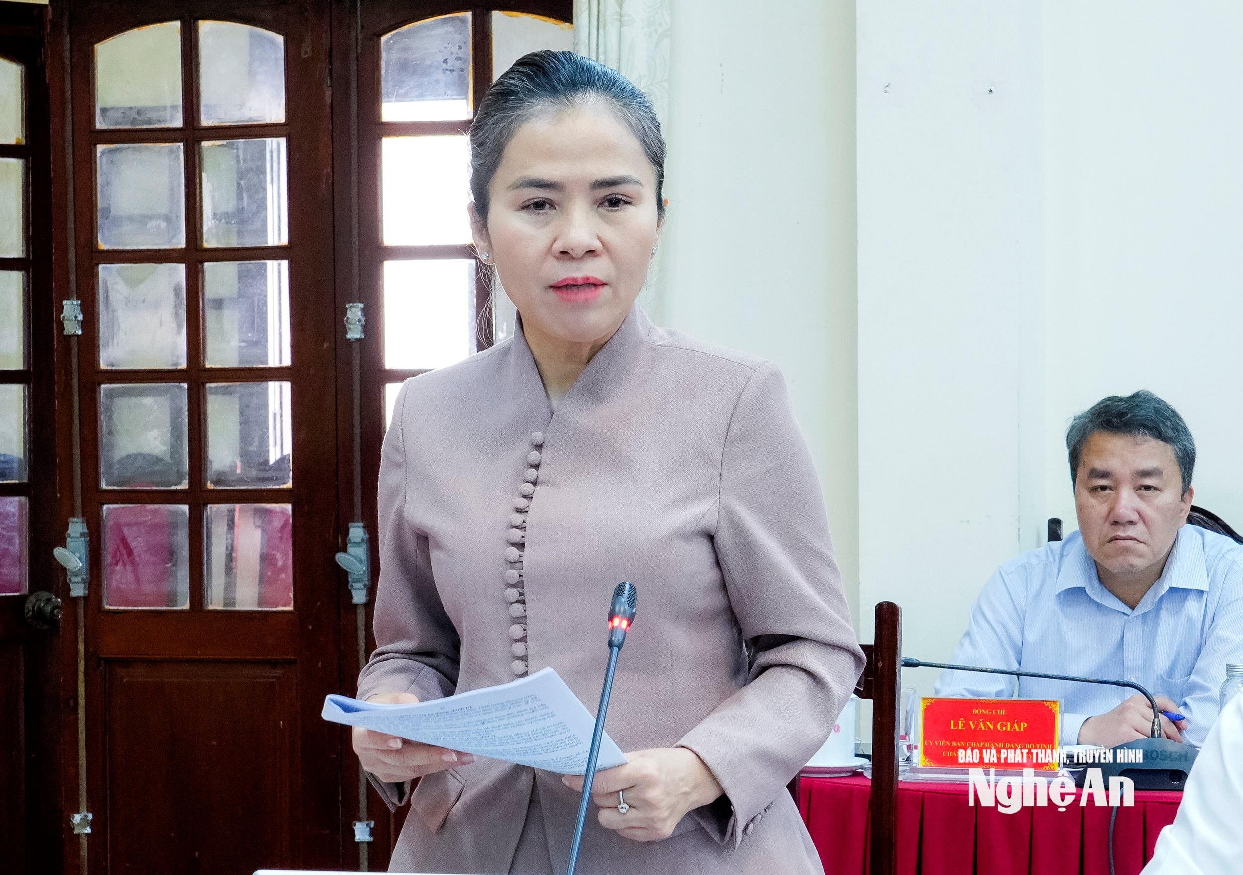 Phó Bí thư Tỉnh ủy, Chủ tịch Ủy ban MTTQ tỉnh, Trưởng Đoàn ĐBQH tỉnh Võ Thị Minh Sinh phát biểu tại phiên họp. Ảnh: Phạm Bằng
