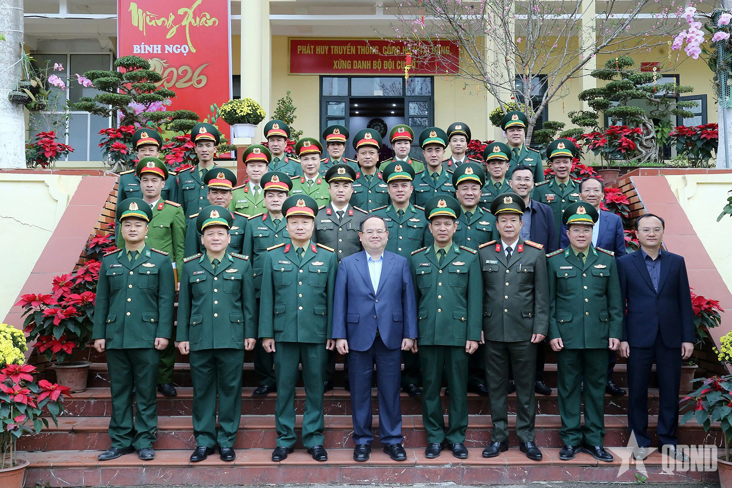 Đồng chí Quản Minh Cường, Ủy viên Trung ương Đảng, Bí thư Tỉnh ủy, Trưởng Đoàn ĐBQH tỉnh, cùng đoàn công tác chụp ảnh lưu niệm cùng cán bộ, chiến sĩ, lực lượng vũ trang trên địa bàn xã Hoành Mô.
