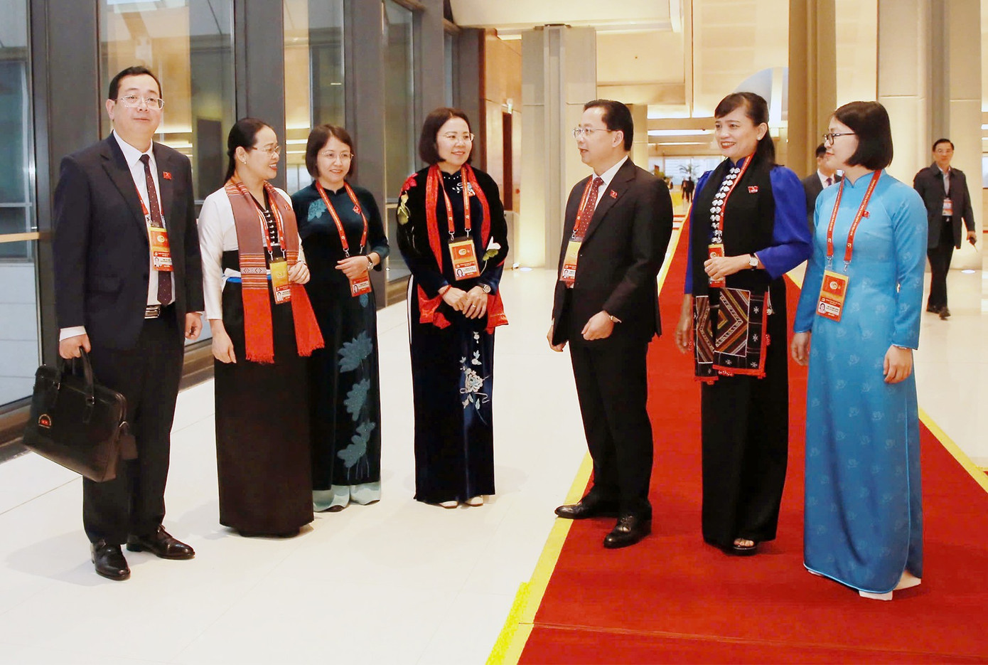 Ông Hoàng Văn Nghiệm (thứ 3 bên phải) trao đổi với đại biểu dự Đại hội đại biểu toàn quốc lần thứ XIV của Đảng. Ảnh: Báo Sơn La.