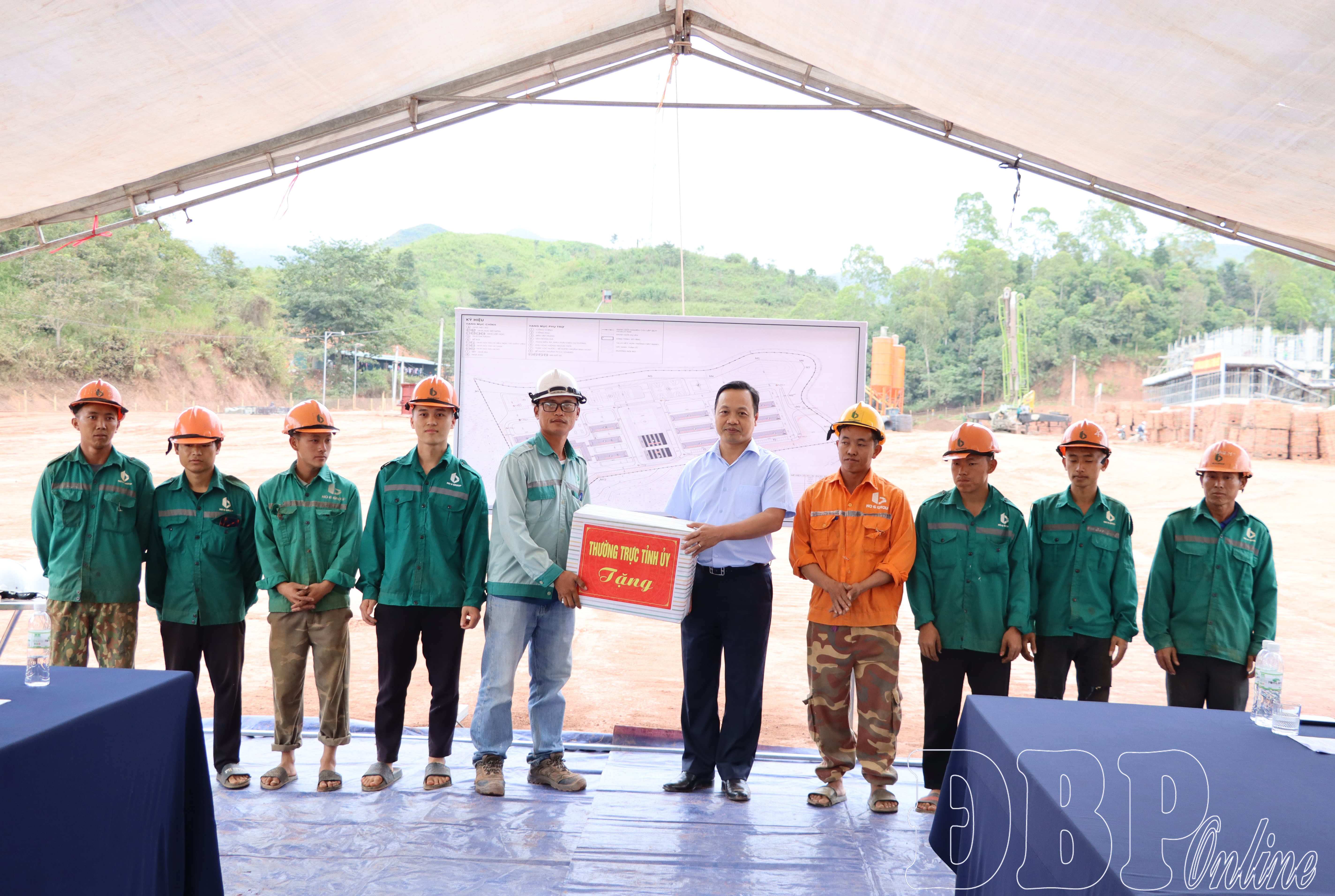 Bí thư Tỉnh ủy Trần Tiến Dũng tặng quà công nhân thi công công trình.