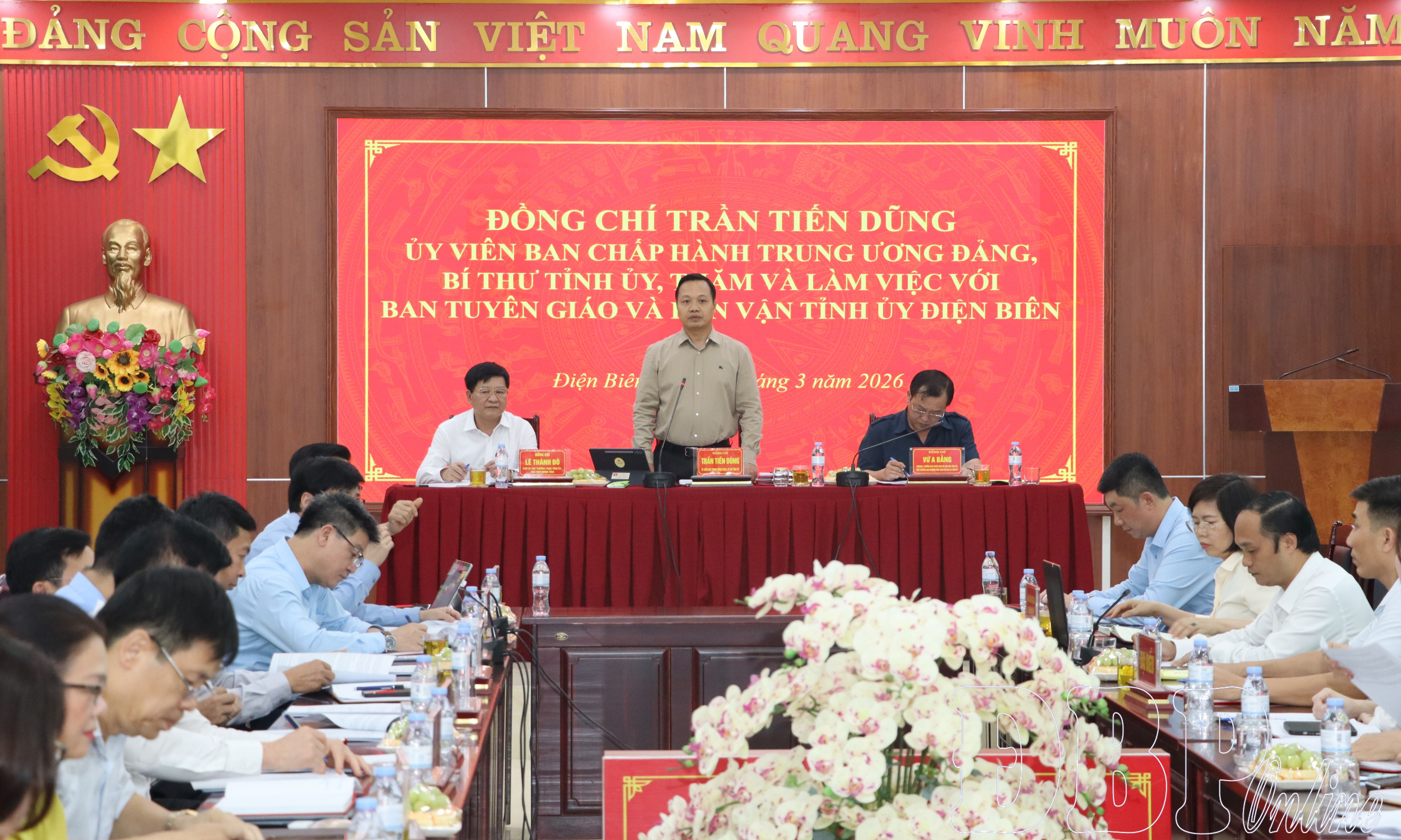 Kết luận buổi làm việc, Bí thư Tỉnh ủy Trần Tiến Dũng ghi nhận, đánh giá cao kết quả Ban Tuyên giáo và Dân vận Tỉnh ủy đạt được trong 3 tháng đầu năm 2026. Đồng chí nhấn mạnh: Ban Tuyên giáo và Dân vận Tỉnh ủy tiếp tục phát huy, nỗ lực hoàn thành toàn diện các mục tiêu, nhiệm vụ đề ra. Trong đó, tập trung bảo vệ nền tảng tư tưởng của Đảng, chủ động tham mưu đấu tranh phản bác các quan điểm sai trái, thông tin xấu độc, nhất là trên không gian mạng; tiếp tục quán triệt, triển khai các nghị quyết, chương trình hành động của Trung ương, của tỉnh bảo đảm nhanh, cụ thể, thực chất, gắn với tổ chức thực hiện ngay sau khi ban hành. Đồng thời, nắm chắc tình hình tư tưởng, dư luận xã hội, tôn giáo; chủ động dự báo, tham mưu xử lý kịp thời từ cơ sở, không để phát sinh điểm nóng.