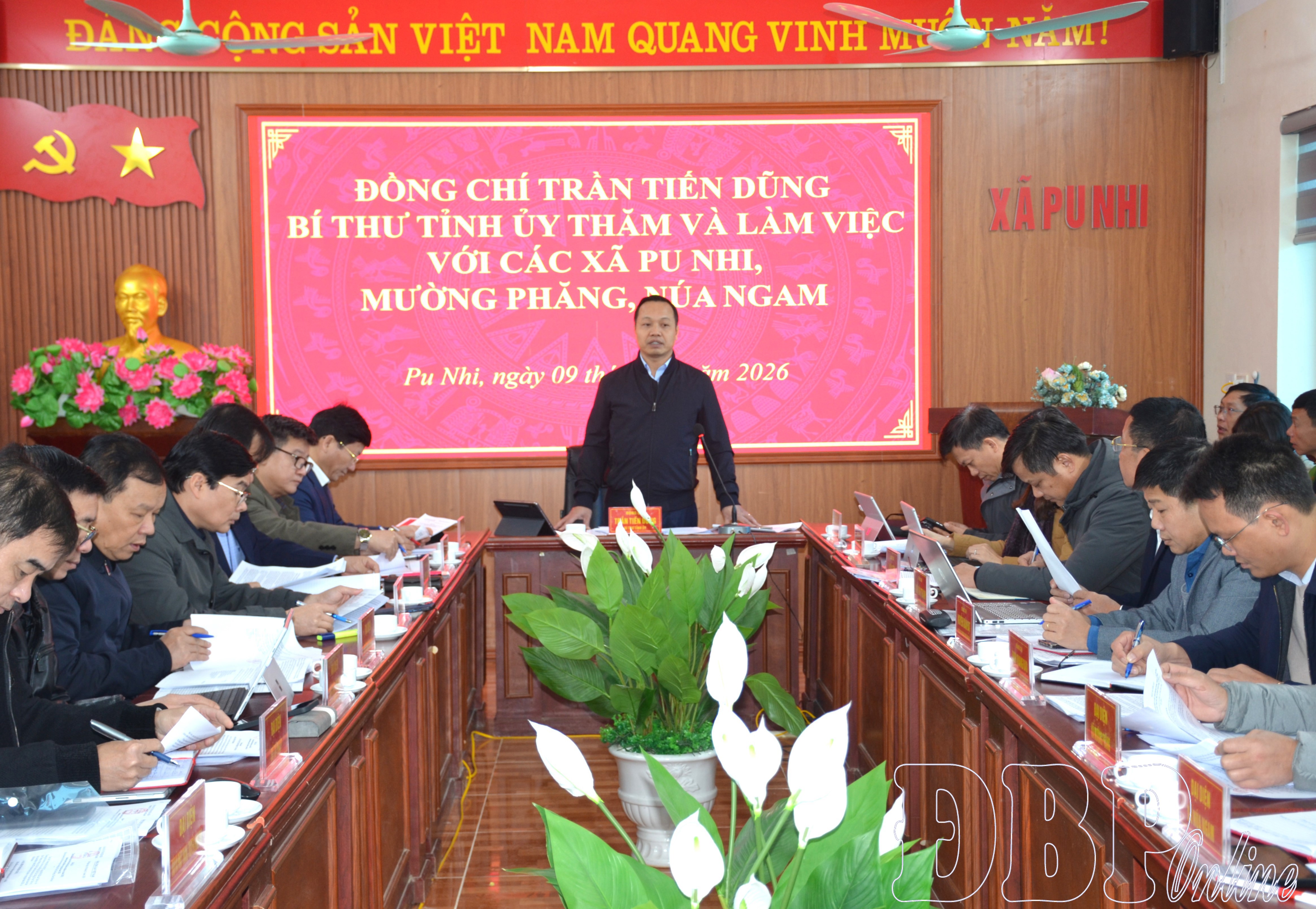 Kết luận buổi làm việc, Bí thư Tỉnh ủy Trần Tiến Dũng ghi nhận và đánh giá cao những kết quả mà các xã đã đạt được trong thời gian qua. Đồng chí cũng đề nghị cấp ủy, chính quyền 3 xã: Mường Phăng, Pu Nhi và Núa Ngam tiếp tục đẩy mạnh công tác xây dựng Đảng, xây dựng hệ thống chính trị trong sạch, vững mạnh và đổi mới phương châm theo hướng cụ thể, rõ người, rõ việc, rõ trách nhiệm. Thường trực, Ban Thường vụ Đảng ủy các xã phải có trách nhiệm triển khai ngay các nghị quyết của tỉnh về tái cơ cấu ngành nông nghiệp, phát triển đô thị, kinh tế tư nhân, cải cách hành chính. Đối với phát triển du lịch cần có sự kết nối giữa các địa phương. Các địa phương tập trung giải ngân hiệu quả các nguồn vốn chương trình mục tiêu quốc gia, đẩy mạnh thực hiện quy hoạch và khi có quy hoạch chủ động mời gọi các nhà đầu tư.