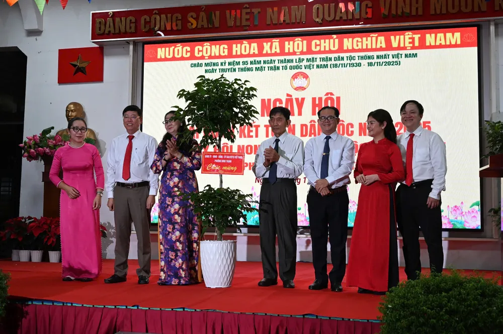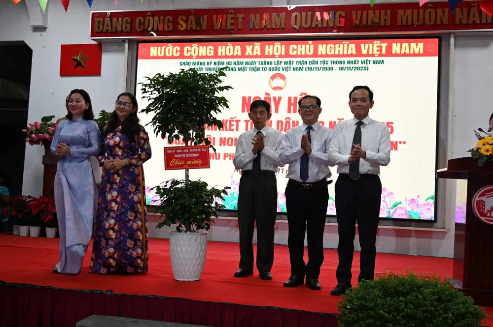 Lãnh đạo TP.HCM cùng đại diện MTTQ và các ban ngành địa phương dự Ngày hội Đại đoàn kết năm 2025 tại Khu phố 5, phường Bình Thạnh. Ảnh: PHẠM HẢI