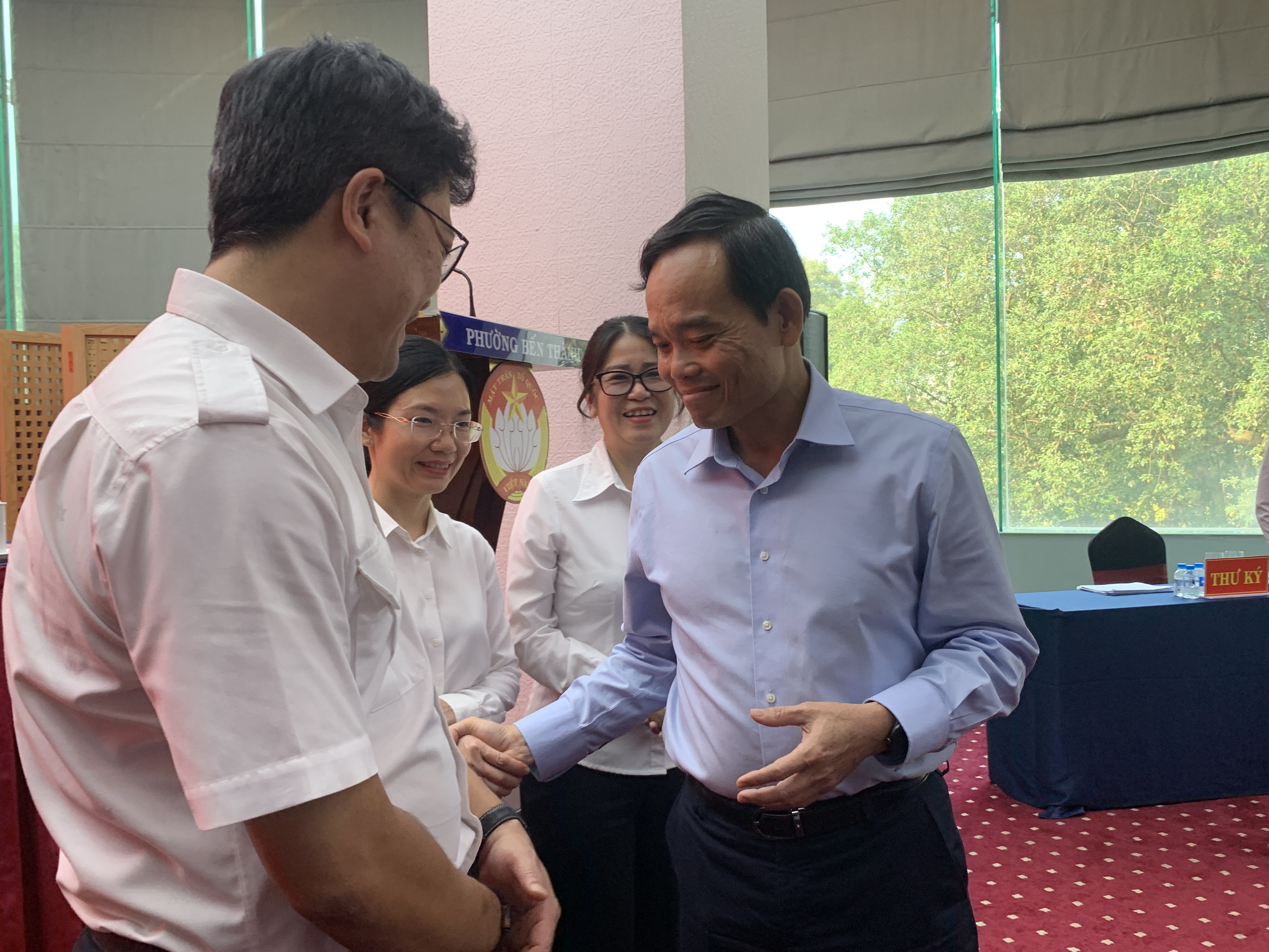 Bí thư Thành ủy TP.HCM Trần Lưu Quang trao đổi với đại biểu sau buổi tiếp xúc. Ảnh: THANH TUYỀN