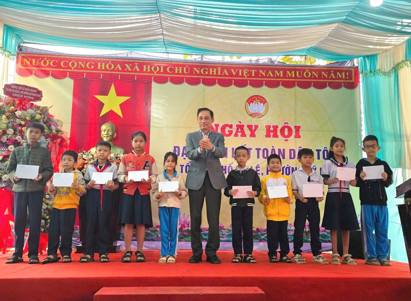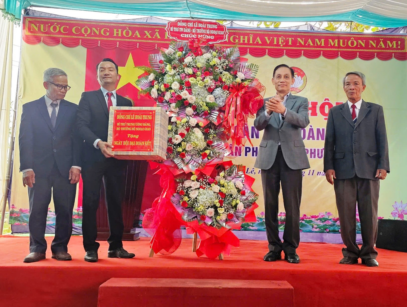 Bí thư Trung ương Đảng, Bộ trưởng Bộ Ngoại giao Lê Hoài Trung tặng lẵng hoa chúc mừng Ngày hội Đại đoàn kết toàn dân tại Huế.