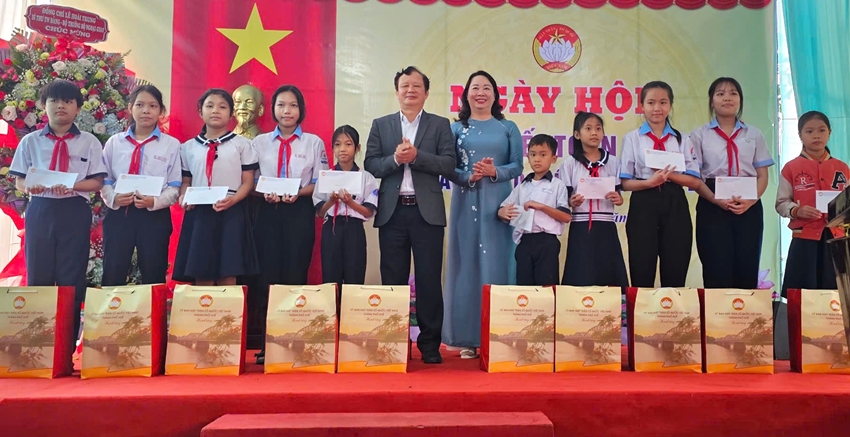 Bí thư Trung ương Đảng, Bộ trưởng Bộ Ngoại giao Lê Hoài Trung trao quà cho các em học sinh tổ dân phố Dạ Lê