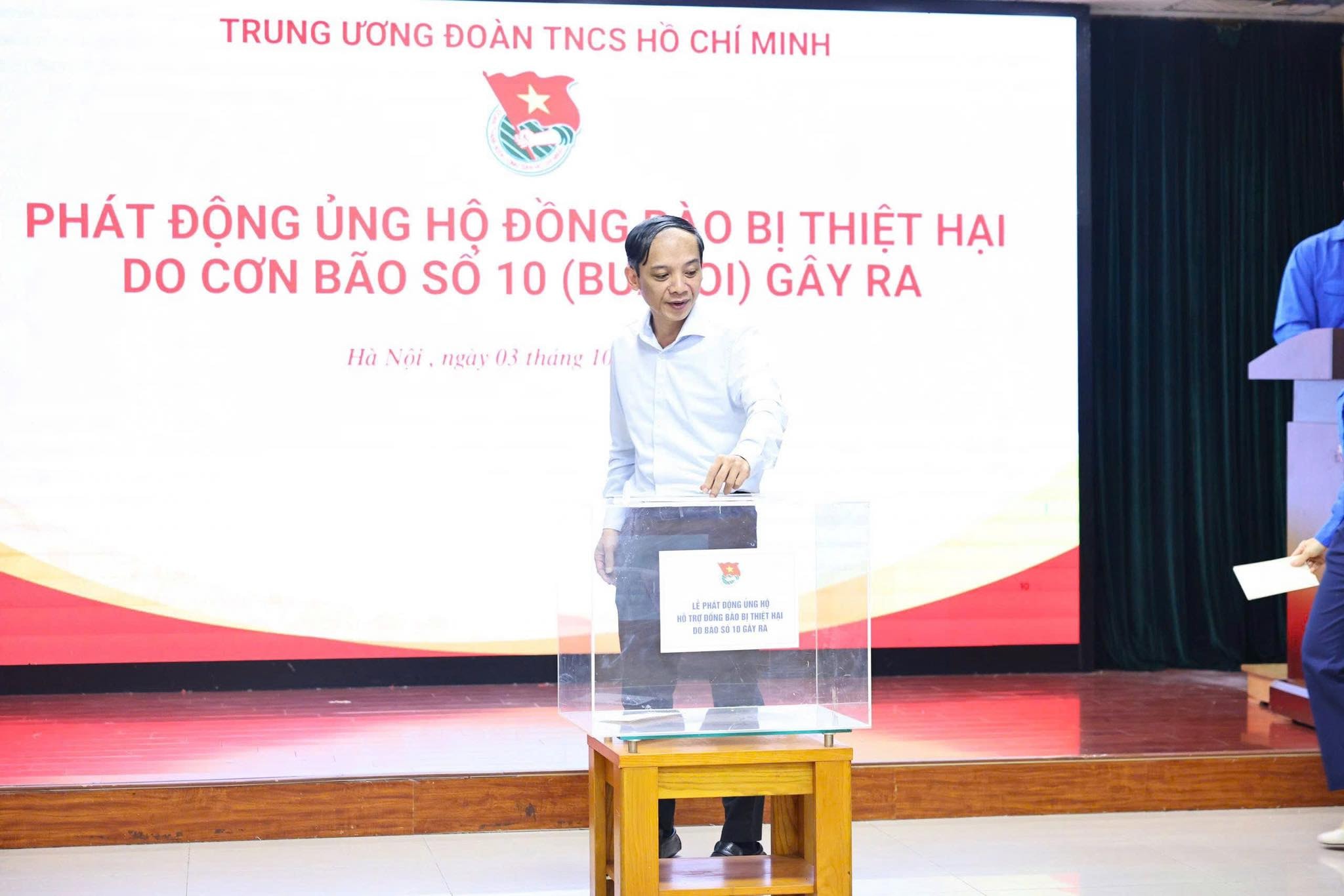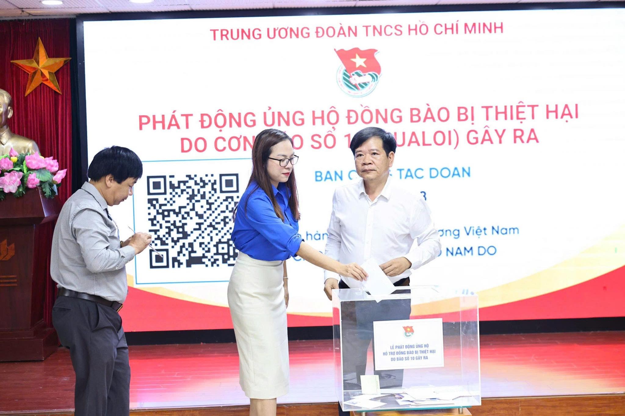 Bí thư T.Ư Đoàn - Nguyễn Phạm Duy Trang và Trưởng ban Công tác Đoàn - Bùi Minh Tuấn , ủng hộ đồng bào chịu thiệt hại do bão số 10 (ẢNH: ĐĂNG HẢI)