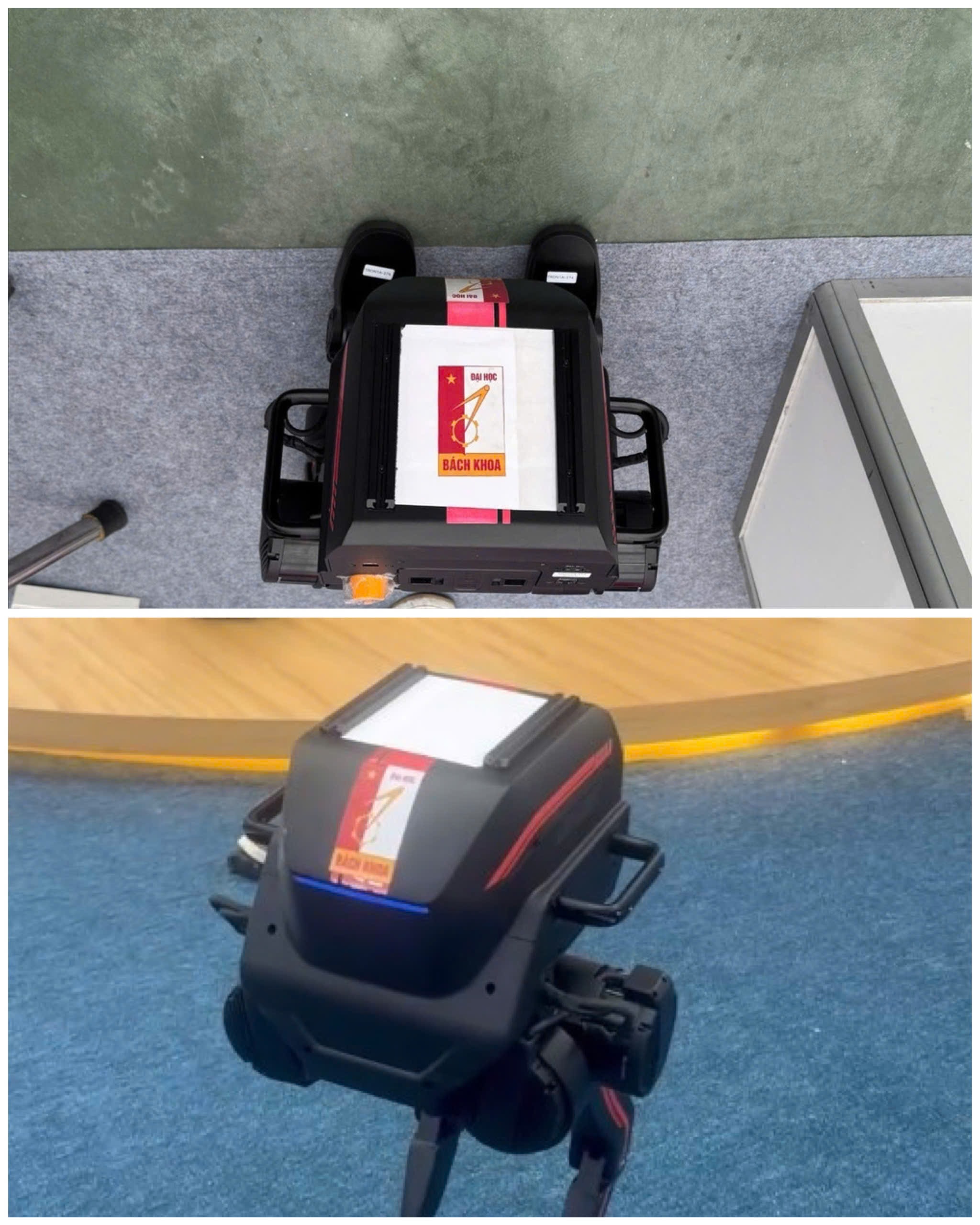 Hình ảnh mẫu robot hai chân do Đại học Bách khoa Hà Nội trưng bày, được cho là đã che hoàn toàn logo và nhãn mác của nhà sản xuất nước ngoài