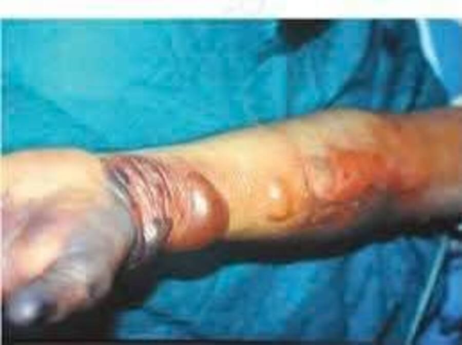 Bệnh nhân N.Đ.Đ. (70 tuổi, trú tại huyện Quỳnh Lưu) nhập viện tại Khoa Truyền nhiễm - Bệnh viện Đa khoa Quỳnh Lưu (Nghệ An) trong tình trạng sốt cao, phỏng nước và hoại tử da lan nhanh vùng bàn tay và cánh tay trái.