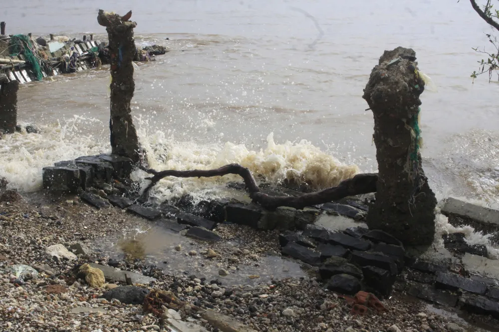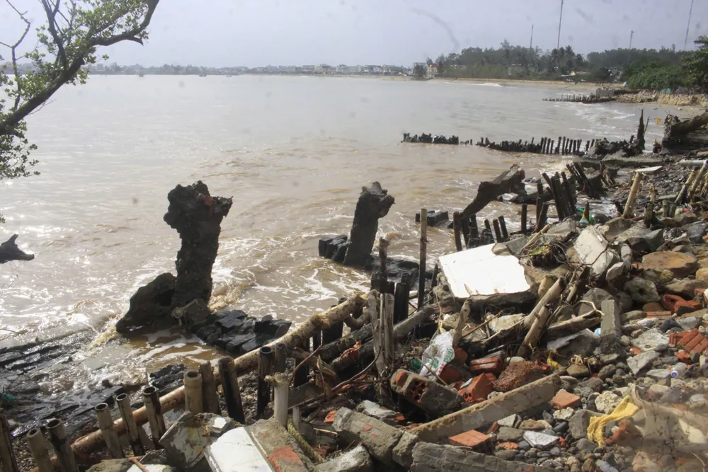 Bờ kè người dân xây dựng để chống sóng biển đã bị đánh sập, còn trơ trọi trụ bê tông.