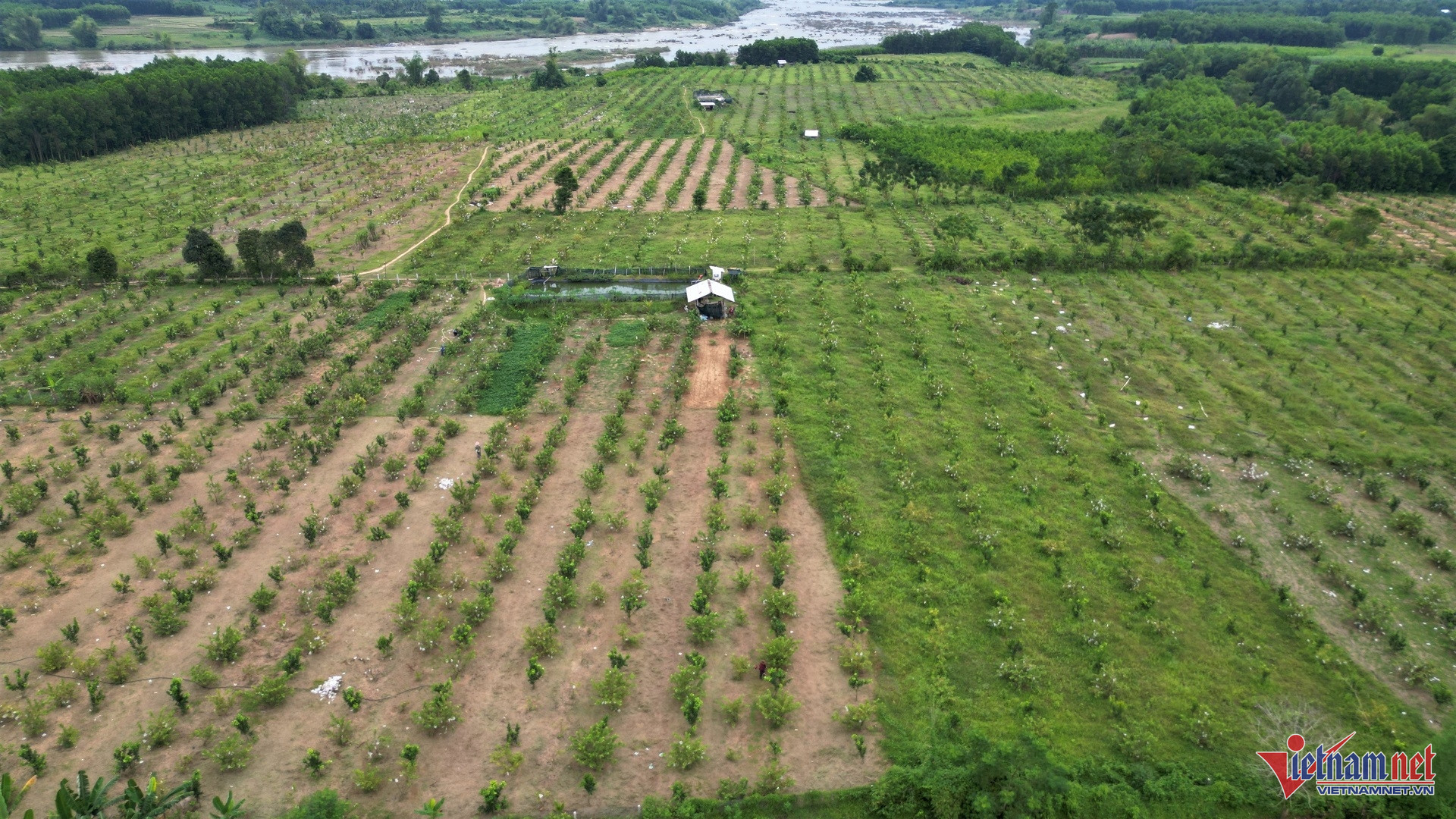 Mảnh đất từng bị chai cứng, nghèo dinh dưỡng sau nhiều năm trồng keo được ông Thơ cải tạo bằng cách đào ao tích nước, bón phân hữu cơ, bổ sung vi sinh để phục hồi. Sau gần ba năm, khu đồi khô cằn ngày nào đã biến thành vườn cây xanh mướt, trĩu quả.